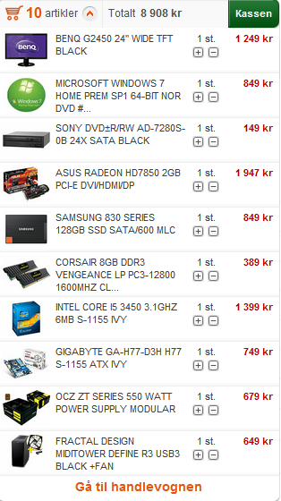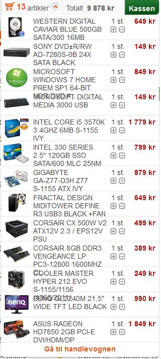 Parapraxis Skrevet 27. juni 2012 Skrevet 27. juni 2012 Hei Har satt sammen en handleliste på komplett.no for en ny stasjonær pc. "Visjonen" er å ha en relativt stillegående pc som skal kunne brukes til spill som Guild Wars 2 når det kommer ut, Portal 2 etc.Jeg trenger absolutt ikke å kjøre spillene på max grafikk, et middels nivå med god flyt holder. Har 9-10k til rådighet, men vil helst ikke strekke meg mye over 9k hvis det er mulig. Handlelisten: http://www.komplett....66-878C5C901FA7 Spørsmål: 1: Passer alt sammen? 2: Vil stockvifta til CPUen bråke mye? Har kikket litt på en Noctua NH-DH 14 CPU-kjøler som har fått bra anmeldelser, men som etter min smak er litt dyr. Forstår det også slik at jeg må fjerne heatsinkene på RAMen hvis jeg skal få plass til den? Andre CPU-vifter som er å anbefale? 3:Får jeg valuta for pengene, eller har jeg noen komponenter som er overpriset i forhold til ytelsen? 4: Hvordan vil oppgraderingsmulighetene være i et 3-4 års perspektiv? Forstår det slik at LGA 1155-socketen vil videreføres i noen år til? 5: Er det verdt det å kjøpe en egen SSD for å kjøre Windows på? 6: Andre innspill? På forhånd takk! EDIT: Vet DVD-spilleren kommer til å bråke, men den kommer uansett til å brukes minimalt. Hei Jonas, skal svare så godt jeg kan på spsm dine. 1. Ja , ettersom jeg kan se passer alt du har satt sammen. 2. Stockvifta vil bråke litt under last, den vil også være mindre effektiv til å kjøle ned CPU'en. Du sier Noctua'en er for dyr, har lagt til et rimeligere alternativ som jeg mener er mest "Bang for the Buck" (HYPER 212 EVO). For å være sikker på at vifta ikke kommer i konflikt med minnemodulene har jeg valgt såkalt " low profile" minne. 3. Jeg mener personlig at du velger noen litt for billige løsninger for å spare litt penger, løsninger som egentlig er dyre når man ser de i sammenheng med hva man får for en hundrelapp eller to ekstra. For eksempel den 40 GB SSD-disken du har valgt koster 729,- mens hvis du ser på oppsettet jeg har valgt så går du opp til 799,- for å få 120 GB. Ingen tvil om hva som lønner seg der spør du meg. Når det kommer til hovedkortet du har valgt mener jeg det også er et feilsteg, dropp ITX og gå for ATX, en økning på 80,-kr hvis du ser på hovedkortet jeg har valgt. Samme med CPU'en, velg en I5 3570K istede og få en betydelig bedre CPU som også kan overklokkes lett og uten fare til 4000Mhz.Jeg vil anslå at den da vil yte rundt 20% raskere en Cpu'en du har valgt. Ellers har jeg forandret på litt småting her og der i forsøk på å presse en best mulig maskin inn i et budsjett med tak på 10 000,-kr. Du kan jo evt. fjerne harddisken på 500GB og spare 600,-kr hvis du mener du kan klare deg med 120GB lagring på SSD'en. 4. Mulighetene for oppgradering på LGA 1155 er jeg usikker på, fremtiden ligger i flere kjerner på CPU og da er det for øyeblikket sokkel 2011 som gjelder. Har ingen info om CPU'er med mer en 4 kjerner som kommer til LGA 1155. Men ikke glem at 1155 på Z77-brikkesettet er helt nytt, med USB 3 og andre ting som gjør at en maskin vil holde seg i mange år til. Evt. skjermkortet kan jo byttes om et par år uten problemer. 5. Ja , ja og atter ja, SSD er kommet for å bli. Å ikke kjøpe det til en ny maskin vil være dumt. SSD har gitt et stort løft i ytelse og i brukeropplevelsen. 6. Skjermkortet jeg har valgt kan kjøre Battlefield 3 på Ultra-settings med en fps rundt 30. En løsning basert på AMD-cpu vil etter min mening gi mye mindre for pengene. Dustin.no gir deg garantert mest for pengene, og fordelen av å bare måtte behøve å forholde deg til en leverandør.