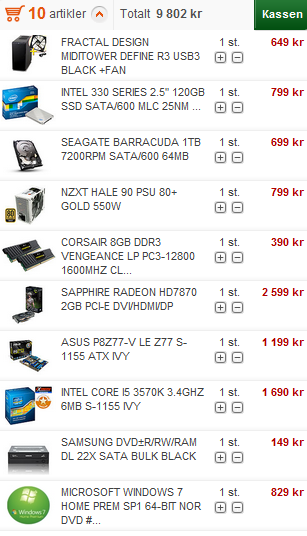 Olestokk Skrevet 8. juli 2012 Skrevet 8. juli 2012 Her er hva jeg ville tatt: Noe likt som Jazzfudge, noe annerledes, hovedsaklig var det for å få vekk den heslige strømforsyningen som hører hjemme i en 5000kr PC og for å sette det opp i en butikk. Det er bra å sette det opp i en butikk fordi da kan du velge en butikk som faktisk klarer å håndtere produktene og som er gode på service, du slipper også å betale frakt fra flere butikker 1
