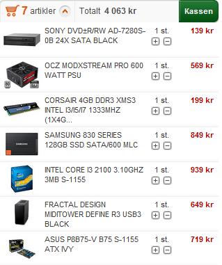 LMH1 Skrevet 16. juli 2012 Skrevet 16. juli 2012 (endret) Angående kabinett ville jeg heller spart litt penger her: (Brukt komplett som utgangspunkt). Samsung SSD 830 Series 128GB 2.5" OEM SATA 6Gb/s (SATA3.0) 520MB/320MB/s read/write, Basic Kit Varenr.:752104 Lagerstatus:100+ stk. på lager. 749.00 Kingston ValueR. DDR3 1333MHz 2x4GB, CL9 Non-ECC, 1.5V, 512Meg x 64, 240pin Varenr.:578917 Lagerstatus:100+ stk. på lager. 378.00 APLUS Case CS-500 Midi Tower Sort ATX, mATX, 2x USB, 1x eSATA, Audio Varenr.:586352 Lagerstatus:38 stk. på lager. 395.00 Intel® Core i3-2130 Processor Socket-LGA1155, Dual Core, 3.4Ghz, 3MB, 65W, Boxed w/fan Varenr.:646586 Lagerstatus:18 stk. på lager. 1179.00 Totalt: 2.701,00 Her ville jeg anbefalt å ha litt kraftigere prosessor + ram og heller spare litt på kabinett. Det kabinettet jeg foreslår bør være mere en bra nok til en slik maskin. Endret 16. juli 2012 av LMH1