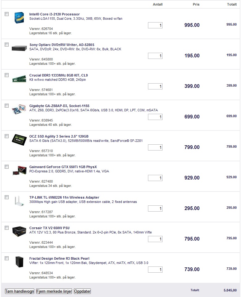 Saksofonklokke Skrevet 25. juli 2012 Skrevet 25. juli 2012 Hei! Det har seg slik at jeg skal for første gang bygge egen pc, så jeg har satt sammen en liste jeg har plukket litt fra Sticky, og delvis på egenhånd. Har prøvd å sørget for at sockets og komponenter passer, men er usikker på om det er noe gunstig setup. Valgte 120gb SSD over noe HDD, jeg har alt av filer og lignende på ekstern disk, så fant ut at jeg heller ville ha bedre lastetid på spill og windows. Har null peil på dette, så det jeg spørr om er egentlig om noen kan se over lista, si hva jeg trenger å oppgradere, og hva jeg ikke trenger. Budsjettet mitt ligger på cirka 6k.