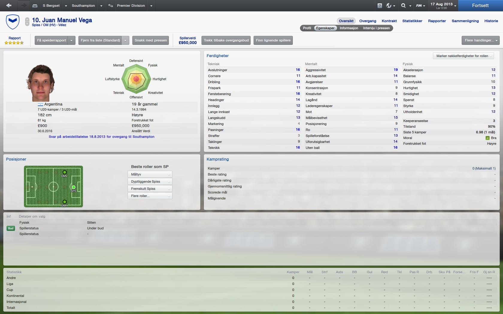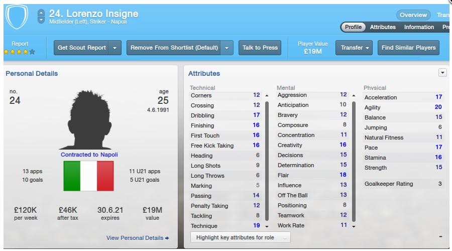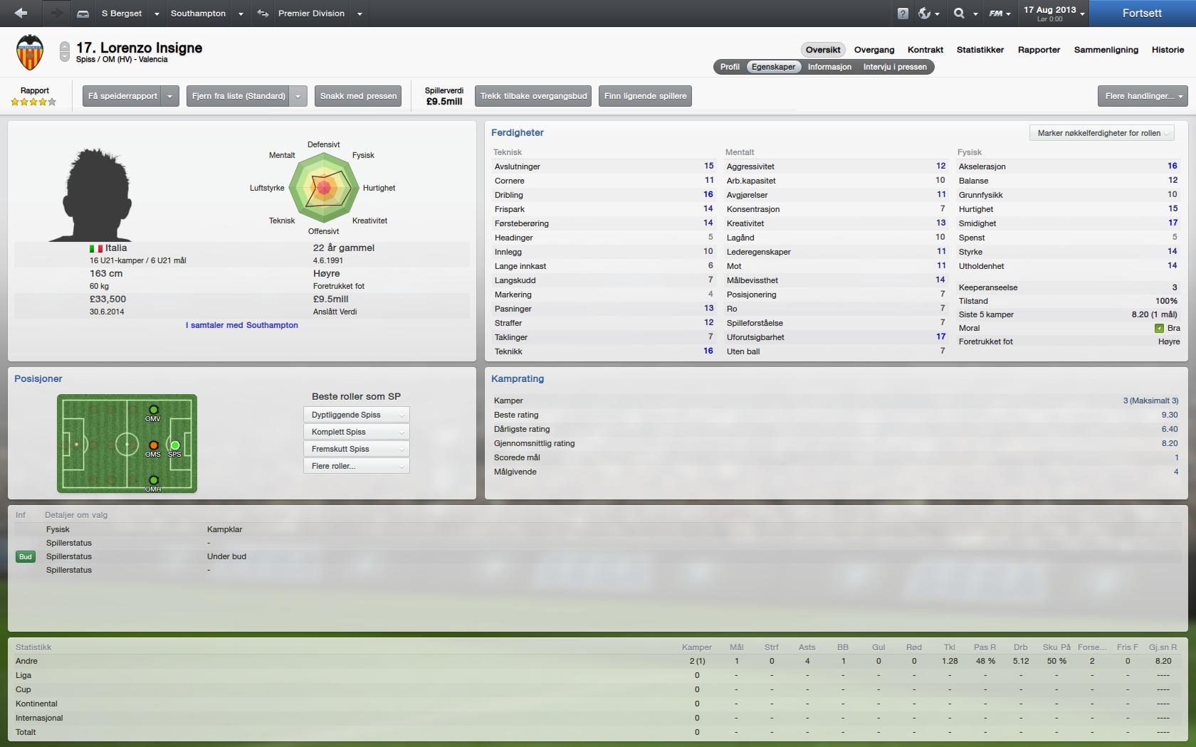 G27 Skrevet 29. desember 2012 Skrevet 29. desember 2012 Klarer ikke å bestemme meg om hvilke av disse to jeg skal signere: Lorenzo Insigne - Koster meg £9,5 mill + £52K lønn Juan Manuel Vega - Koster meg £5,75 mill + £12K lønn Har allerede Mattia Destro og Carlos Fierro som unge spisstalenter. Hadde egentlig tenkt å rotere på disse to på topp, og jeg hadde da bare tenkt å signere en reservespiss som også kunne spille i andre roller. Meeen så kom jeg over Vega. Føler han har så gode stats som 19 åring at jeg ikke kan la sjansen gå fra meg. "Regen" allerede sommeren 2013 er ikke spesielt kult, men.... Insigne ser ikke spesielt deilig ut på det første bilde, men om jeg skal tro på "footballmanagerstory.com, blir han en koselig spiller om få år. "Napoli have not been weakened by the sale of Lavezzi, because this young man has stepped into those shoes. He is able to play up front or on the wing, as could Lavezzi. With good finishing , first touch and technique combined with deadly pace and agility, Insigne is very capable of leading the line, but looks like he would be more effective as an Inside Forward to me. For 10m you can’t pass up the opportunity, whether you need a back up or first choice, Insigne is one of the best options available. Best buy rating: 8.5/10" Kan se for meg at Insigne fort tar plassen på venstre ving som brytende spiss. Hvem ville dere gått for? Jeg har ikke råd til begge. Har £11,6 igjen av overgangsbudsjettet og burde egentlig kjøpt en midtstopper, men jeg fant ikke noe digg til under 13 mill.