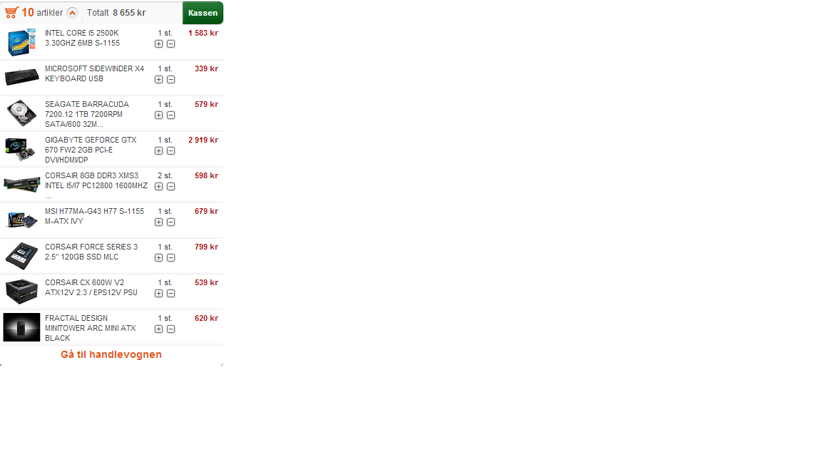 otl Skrevet 1. oktober 2012 Skrevet 1. oktober 2012 (endret) THOR Einride - Intel i5-2500K - 16GB - 120GB SSD + 1TB - Nvidia GTX670 - W7HP er vel det nærmeste vi kommer om du vil ha ferdigbygget maskin om du ikke vil ha det sjekk noe tilsvarende men du må nok minst kjøpe bvare om du skal få bedre kjøp. Sanforce er ikke det lureste med tanke på SSD disker, men til den prisen er dette det beste. Nei, huff.. Dårlig SSD og du må betale for Windows.. :/ Vil heller anbefale dette: http://0o2471.net/46698 Er litt over budsjettet, men den drar BF3 på High med 60+ FPS. (Dustinhome.no) Ikke den beste SSD'n, men at en betaler for windows stemmer vel ikke helt For å vise dette ikke er så veldig dyrt i forhold til å bygge selv, lagde jeg en handlekurv hos dustinhome uten windows. Endret 1. oktober 2012 av otl