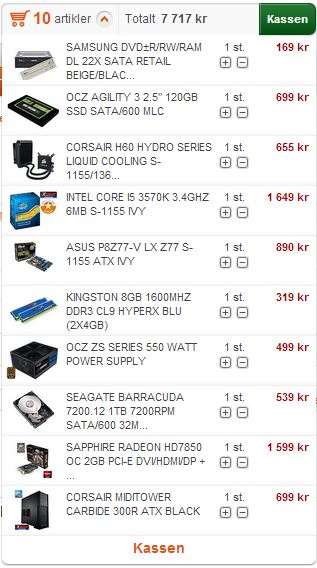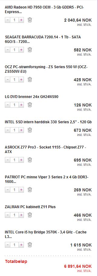 TomKorawit Skrevet 11. november 2012 Skrevet 11. november 2012 Hei! Jeg sitter nå med en maskin som jeg egentlig angrer på at jeg kjøpte. Komponentene er så: Kjøpte pcen for rundt 8000 kroner da, og har tenkt til å selge den for 6800. Er det lite i forhånd til komponentene? Hva bør jeg egentlig selg den for? Her er komponentene jeg har tenkt til å kjøpe: Hva bør jeg gjøre? Beholde den jeg har nå og oppgradere eller skal jeg selge den jeg har nå og kjøpe en ny en? Takk på forhånd!