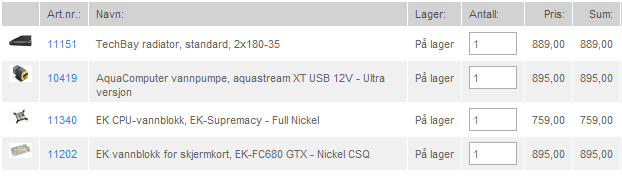 lumfong Skrevet 4. desember 2012 Forfatter Skrevet 4. desember 2012 (endret) Du har stilt MCP655 til laveste hastighet? Husk at du trenger nipler, slanger, "drikke" og fler nipler da! Ja takk, begge deler. ____Pumpe: Klar ____Slange: X ____Vannblokk/gpu: X ____Vannblokk/CPU: https://www.techbay.no/product.html/ek-cpu-vannblokk-ek-supremacy---full-nickel ____Radiator: http://techbay.no/product.html/techbay-radiator-standard-3x180-35?category_id=192 ____Kabelstrømpe: http://techbay.no/product.html/kabelstrompe-tettflettet-o24-o63mm-sort?category_id=13 ____Svamp: http://techbay.no/product.html/aquacomputer-shoggy-sandwich?category_id=162 ____Vifter: https://www.techbay.no/product.html/scythe-gentle-typhoon-120-d1225c12b5ap-15-120x25 ____Sleves: http://de.mdpc-x.com/mdpc-sleeve/sleeve/sleeve-small-gelb-mkii.htm http://de.mdpc-x.com/mdpc-sleeve/sleeve/sleeve-sata-gelb.htm ____Fittings: http://www.watercoolinguk.co.uk/p/Alphacool-1310-10x15mm-Compression-Fitting-G14-Chrome_20706.html http://www.watercoolinguk.co.uk/p/Alphacool-1310-10x15mm-Compression-Fitting-90-Rotary-G14-Chrome_20709.html ____Lys: http://www.performance-pcs.com/catalog/index.php?main_page=product_info&cPath=72_1114&products_id=33682 http://www.performance-pcs.com/catalog/index.php?main_page=product_info&cPath=72_107_836&products_id=32140 ____Tank: http://www.performance-pcs.com/catalog/index.php?main_page=product_info&cPath=59_318_657&products_id=35200 Endret 4. desember 2012 av lumfong
