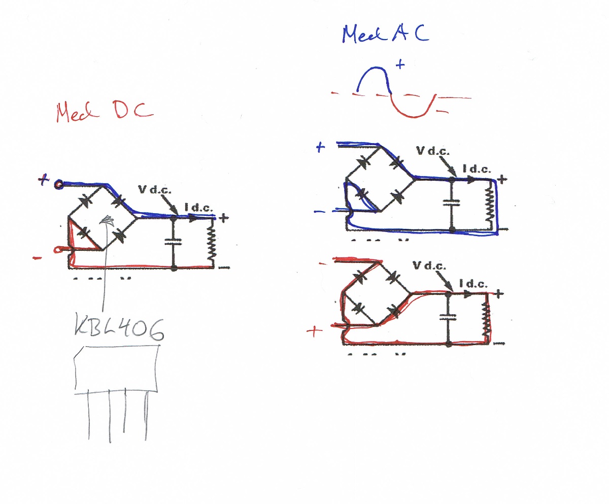 *Petter* Skrevet 16. januar 2013 Forfatter Skrevet 16. januar 2013 Nope, likeretterbroen vil slippe DC gjennom, men med spenningsfallet over diodene Står det 9-12 VAC går skal det nok gå fint med 12 VDC etter likeretteren. Edit: Prøver å forklare det med likeretterbroen med en skisse: Ok, den forklaringa så grei ut. Da monterer jeg likerettern, og tester før og etter. Skal jo bare teste om saken fungerer når den er ferdig. Vet ikke om Elfa har noen små trafoer til audio bruk. 240vac til 12vac.
