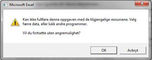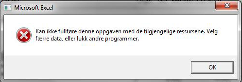Harald Staff Skrevet 25. februar 2013 Skrevet 25. februar 2013 Feilmeldingene forteller så godt feilmeldinger kan. De fleste beskriver operasjoner som krever mer minne enn hva som er tilgjengelig for Excel. Spørsmålet er NÅR kommer disse feilene siden du ikke skjønner hvorfor? Beste hilsen Harald