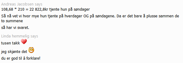 Gjest Slettet+56132 Skrevet 17. januar 2011 Skrevet 17. januar 2011 Min ekspertise ligger i ungdomskole matte og P1 matematikk, ellers så er min matematikk kunnskap ikke bærekraftig i 1T og 2T, her er jeg avhengig av boka og gode eksempler men jeg forstår ikke alt selv om jeg bruker de. Men nå må det sige inn jeg er ikke her for å drive med opplæring i matematikk, min FUNKSJON i tråden er å OPPGI svaret med full utregning i orden. Lurer verten på noe så kan verten komme med enkle spørsmål ellers får verten ta de med seg på neste matte time hvor læreren GIR undervisning.