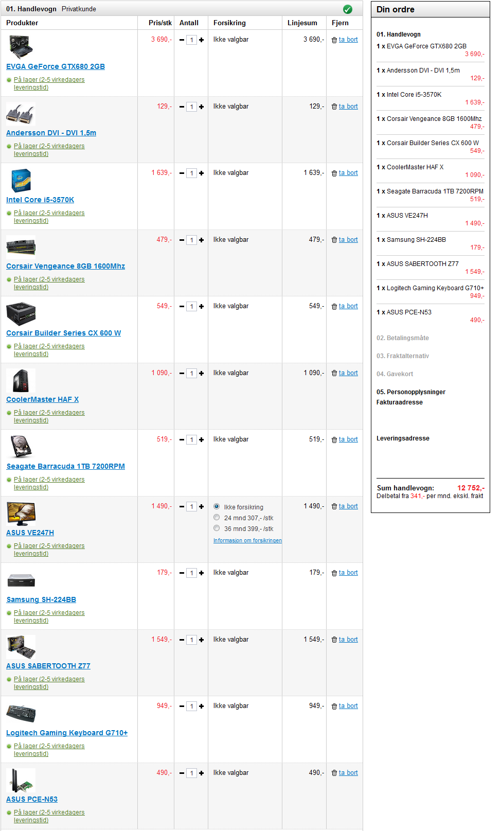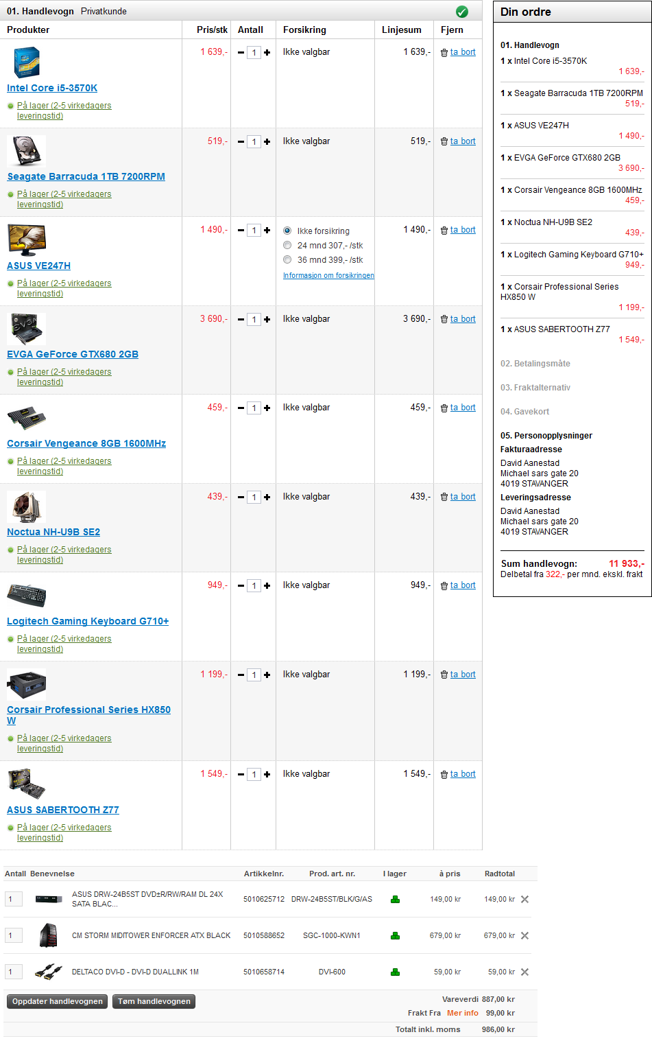 Fredelig Skrevet 27. mars 2013 Forfatter Skrevet 27. mars 2013 (endret) Tusen takk for all hjelp så langt! Slik ser handlelisten ut i skrivende stund: Noen som vet hva frakten kommer til å ligge på? Jeg ser Dustinhome har gratis frakt fram til 7. april, men jeg må bestille senere pga. flytting. Og er et antistatisk armbånd nødvendig? Hvordan bruker jeg det isåfall? Endret 27. mars 2013 av Fredelig
