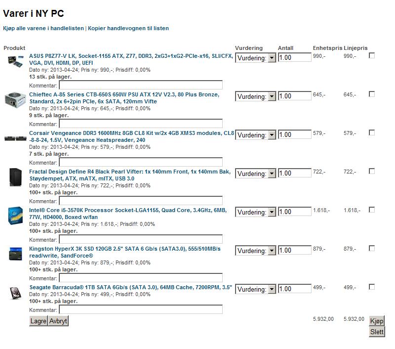 Gjest Slettet-uVTr2vDm Skrevet 24. april 2013 Skrevet 24. april 2013 Da har jeg bestemt meg og takker for all hjelp. Inntil videre bruker jeg mitt gamle skjermkort (GTX 460) da det holdet til mitt behov og kan sanns. drive det jeg skal spille på fullt en liten stund fremover. Så blir det oppgradering til et av de dere anbefalte i senere tid. Her er oppsettet jeg bestemte meg for som vedlegg: