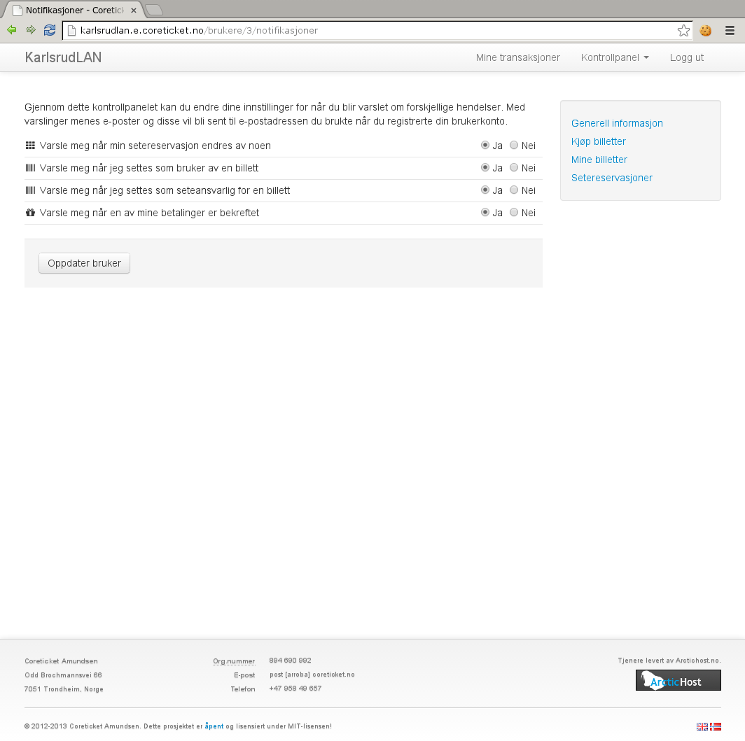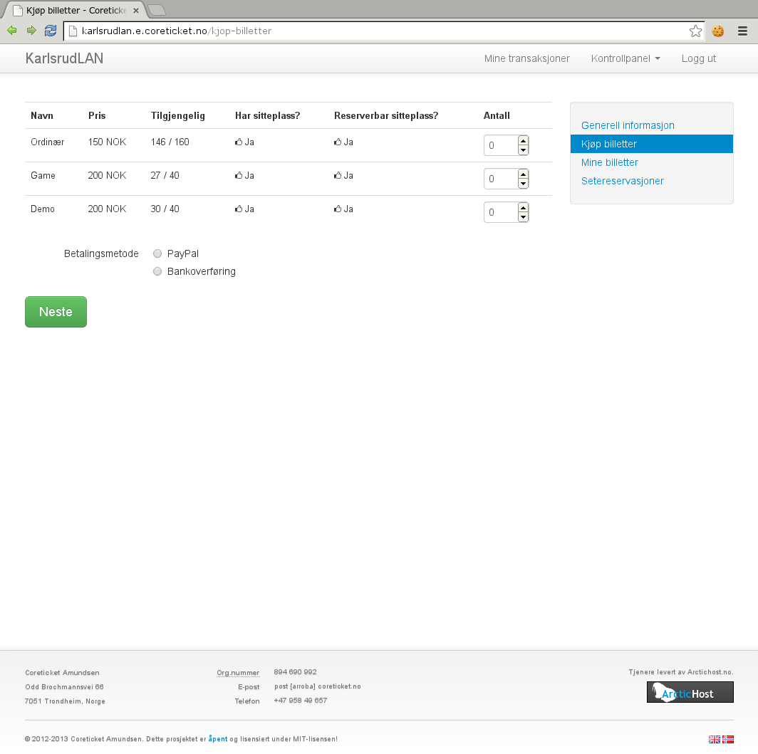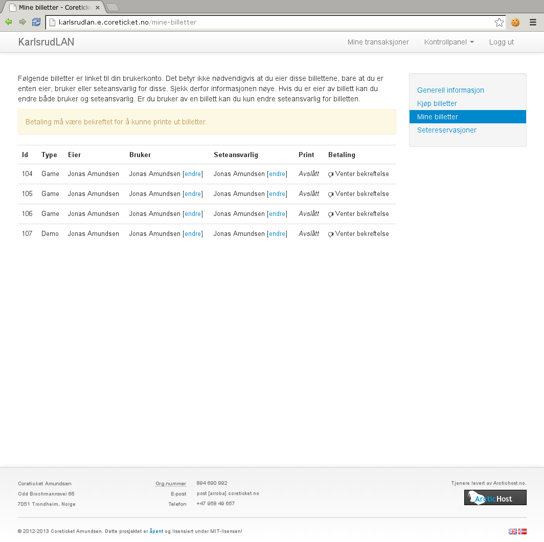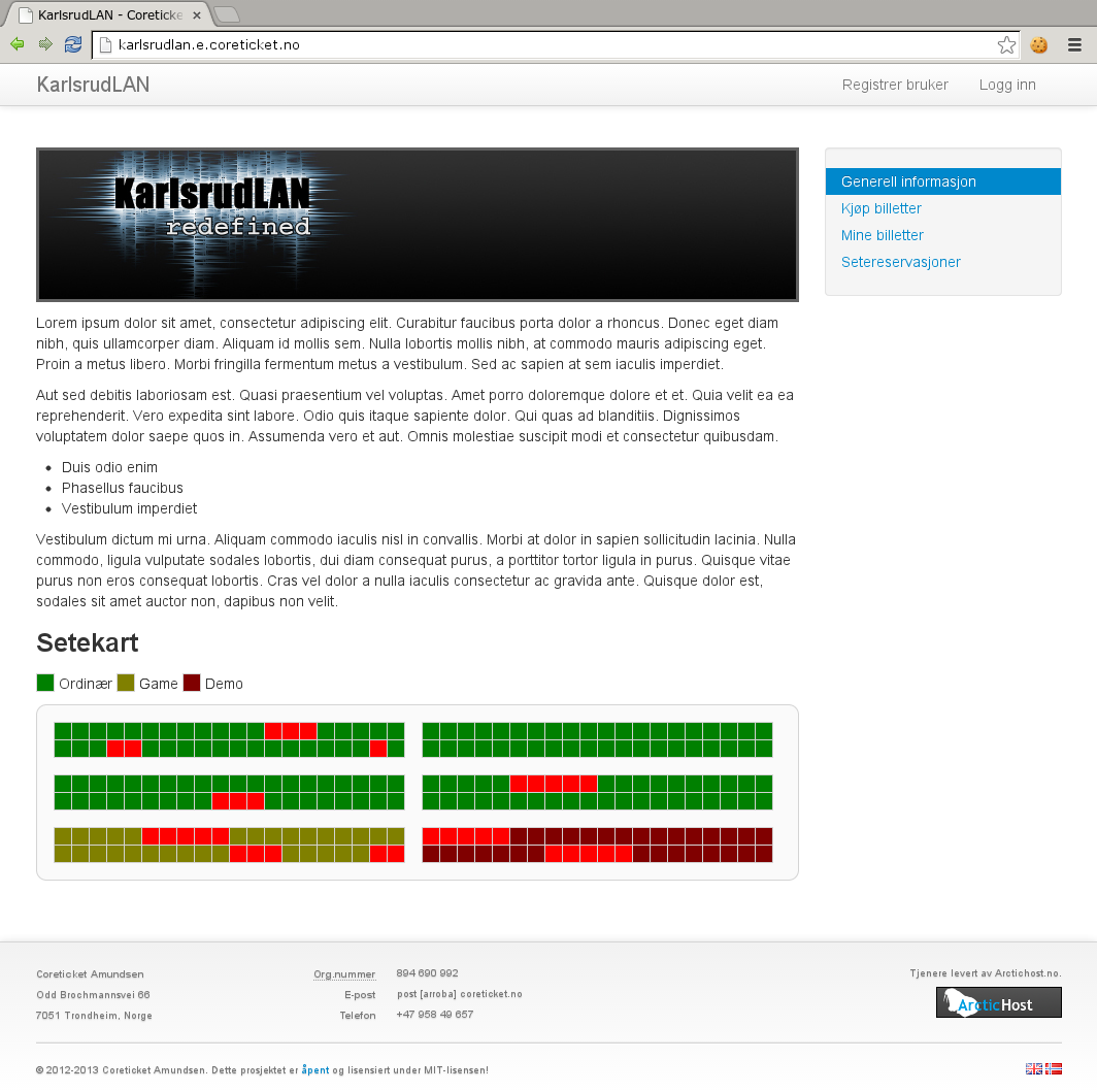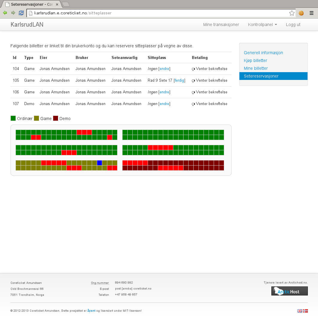 Jonas Skrevet 22. mai 2013 Skrevet 22. mai 2013 Hei, Den observante og rutinerte brukeren vil kanskje huske at jeg tidligere programmerte et online-system for salg av billetter, plassreservering, mm. Prosjektet fikk overraskende mange brukere og det var derfor leit å måtte avslutte videreutvikling og vedlikehold. Siden jul har jeg derimot funnet tid til å forsøke igjen og har hittil kommet opp med et system som gjør ca. det samme som det forrige da jeg forlot det. En av forskjellene nå er at hele prosjektet er åpent og jeg har fått sponset tjenere (VPS) av ArcticHost. I likhet med forrige gang, så er jeg svært interessert i å høre hva andre LAN-arrangører har å si om noe slikt som dette, hva slags funksjoner man vanligvis ser og trenger i slike systemer, o.l. Jeg er villig til å strekke meg ganske langt for å lage tilpassede instanser for å tilfredsstille enkelte arrangementers behov. Tekniske nøkkeldetaljer Prosjektet kjører på en stack bestående av Ruby on Rails, mod_passenger, Apache, Postgres og CentOS 5. Kildekoden ligger fritt tilgjengelig på Github. Fork det og lag pull requests! Flerspråklig. (Foreløpig bare oversatt til norsk og engelsk) Arrangementer kan bruke sitt helt eget (sub-)domene, ved å peke det mot vår IP-adresse. (Ta kontakt dersom ønskelig) Hvert arrangement har sin egen sandkasse, i den forstand at man ikke kan navigere fra et arrangement til et annet arrangement eller til forsiden. Integrert med PayPal. (Krever at ditt arrangementer oppretter en bedriftskonto på PayPal og konfigurerer sine API-parametere) Noe arbeid som gjenstår Anskaffelse av SSL-sertifikater. Mulighet for administratorer å dele ut billetter. Print-out av reserverte plasser. For administratortilgang Opprett en bruker og send meg en PM eller elektronisk post. Gå gjerne crazy, forsøk å brekke alt. Skjermbilder Eksempelarrangementet kan vises her. Forsiden til et arrangement. Bilettkjøp til et arrangement. Brukerens billetter til et arrangement. Plassreservering til et arrangement. Kontrollpanel for notifikasjoner til en bruker.