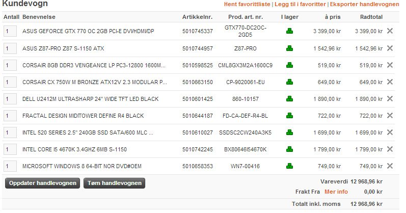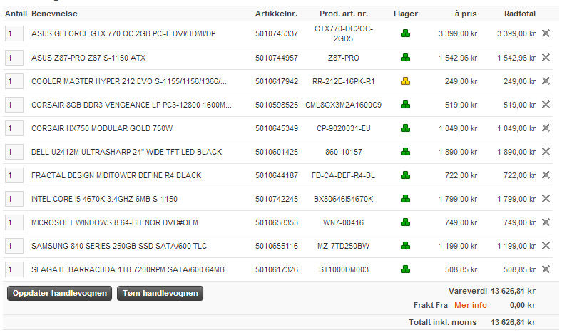 Bananfutteral Skrevet 3. juni 2013 Forfatter Skrevet 3. juni 2013 Er det greit med 750W? I så fall er dette oppsettet så langt: Ser det greit (og ikke minst komplett) ut? Hva burde jeg eventuelt kutte ned på for å få ned prisen litt?