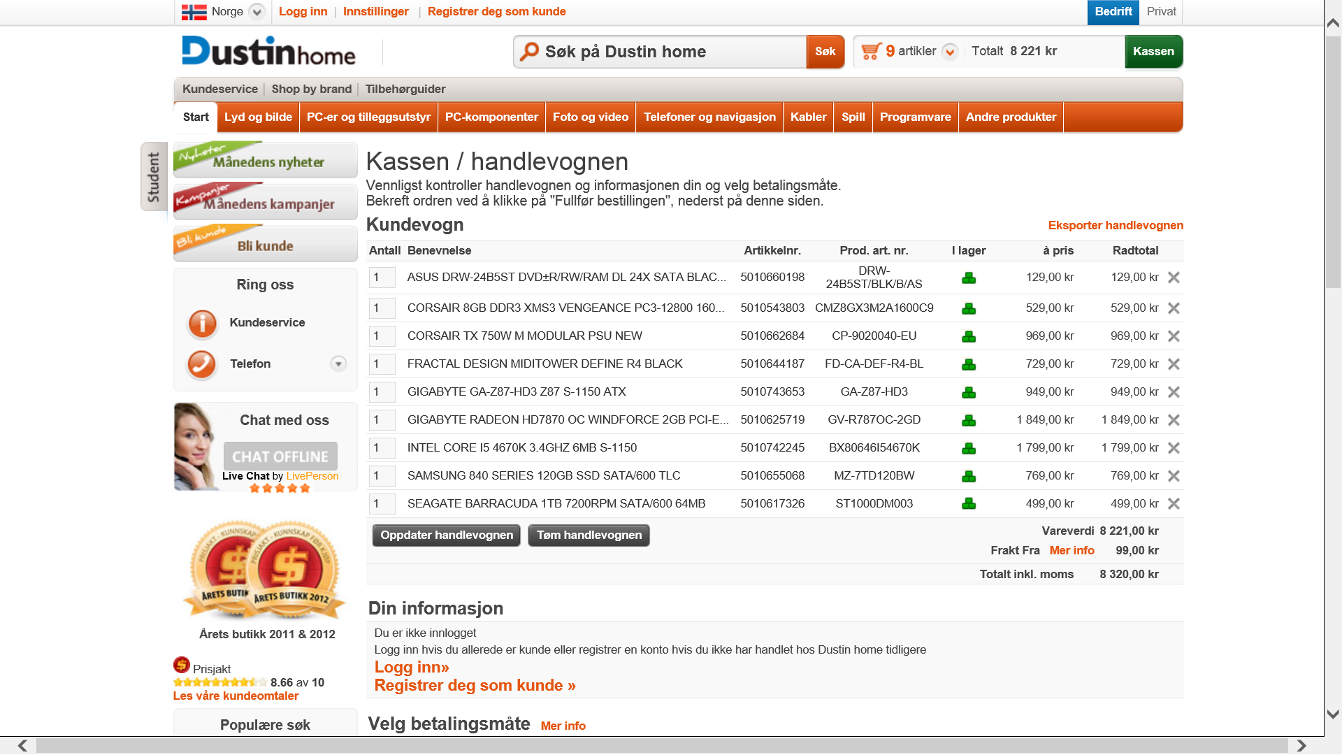 Vigilante85 Skrevet 15. juli 2013 Skrevet 15. juli 2013 Delene passer. Personlig ville jeg byttet ut hovedkortet med noe fra gigabyte eller msi. http://www.dustinhome.no/product/5010746497/msi-z87-g45-gaming-z87-s-1150-atx/ Laget en ny liste til deg fra netonnet. 1 x MSI Z87-G45 GAMING 1 249,- 1 x Intel Core i5-4670K 1 749,- 1 x Kingston HyperX Grey 8GB 1600MHz 499,- 1 x Antec HCG-620M 620W Continuous Power 649,- 1 x Samsung SH-224BB 179,- 1 x Seagate Barracuda 1TB 7200RPM 499,- 1 x Samsung 840 Basic 120GB 729,- 1 x Fractal Design Define R4 Black 749,- 1 x MSI GeForce GTX760 2GB TF OC 2 249,- Sum handlevogn: 8 551,-