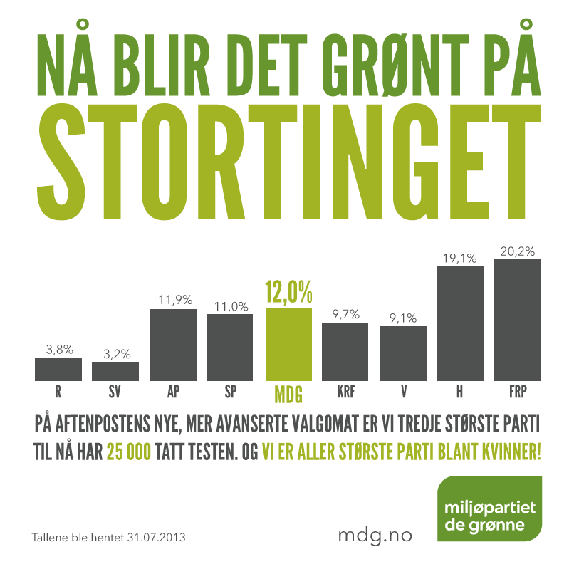 jonlem Skrevet 2. august 2013 Forfatter Skrevet 2. august 2013 Apropos MDGs vekst .. dette bildet blir delt flittig på Facebook om dagen; Dette må riktignok sees på som et resultat blant et relativt smalt utvalg - Aftenpostens lesere, som tar valgomaten deres, i sommerferien. Eller noe sånt. Men allikevel - spennende. Det blir neppe 12% som stemmer MDG til høsten, men at såpass mange ender opp med å få beskjed om at de er "mest enig" med MDG bør ha en viss effekt. (Da jeg tok den sto det at drøyt 22000 hadde tatt den).