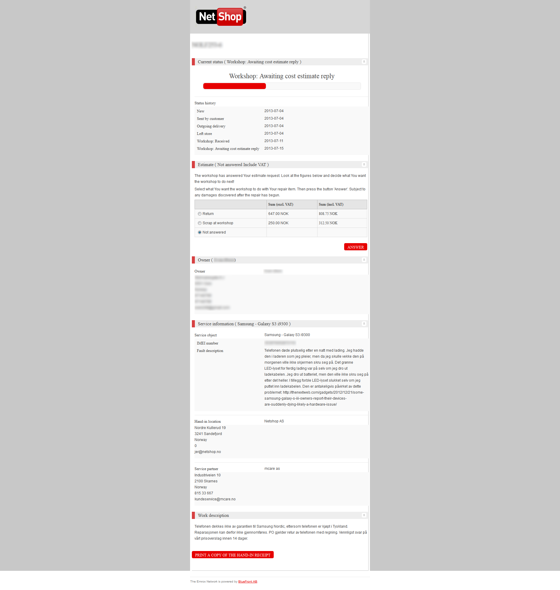 Jeg fikk omsider tak i Netshops nye eiere og fikk en returlapp for å sende telefonen inn til mCare AS. I dag fikk jeg melding fra verkstedet om at: