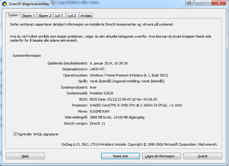 Larsvemy Skrevet 8. januar 2014 Forfatter Skrevet 8. januar 2014 (endret) Tenkte ikke på endringer du har gjort, men endringer Acer har gjort i produksjon av maskinen. Uten å vite sikkert, så kan de ha byttet hovedkort leverandør av en aller annen grunn, og at BIOS filen på support sidene er til det nye hovedkortet de har begynt å bruke i den maskinen. Kan også være at de har gått over til ny versjon av hovedkortet når de begynte og selge den med Win8 slik at revisjons nr ikke stemmer lenger og at det er derfor du ikke får oppdatert. NB: Vet ikke om dette gjelder for den serien med maskiner, men problemet med og oppdatere med BIOS kan vise til noe slikt. Edit - Kan være at oppskriften til Steffen94 kan hjelpe dersom du ikke har prøvd det. det er ikke noe jeg finner i DirectX diagnostics, tok et screenshot om det hjelper. EDIT: Endret 8. januar 2014 av Larsvemy