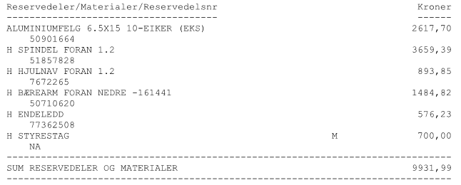 pcp160 Skrevet 17. januar 2014 Skrevet 17. januar 2014 Det jeg ser foreløpig er at det har falt av en metallbit fra felgen og at det ene hjulet er mye nærmere bilen enn det andre. Så når jeg svinger til venstre hører jeg at hjulet skraper mot bilen? Hva tror dere kan ha skjedd? Er kanskje vanskelig å si, men høres det ut som en stor skade? Setter utrolig stor pris på svar! Som andre allerede har sagt kan du være heldig å slippe unna med en felg og nedre bærearm (som oftes er bøyd hvis hjulet har flyttet seg bakover/"nærmere bilen"). Har man en gammel bil og/eller bare skal ha den tilbake på veien billigst mulig bytter man det som er synlig bøyd/skadet. Alle skader må vurderes individuelt, men kan i alle fall si at når en slik skade gjøres som en forsikringssak så bytter man gjerne felg, bærearm, spindel, hjullager, endeledd/styrestag, og av og til også fjærben. Delene som har synlige skader er jo ikke noe å diskutere, resten skiftes i hovedsak av to grunner. Først og fremst; deler som hjullager eller spindel av aluminium kan etter en smell hard nok til å bøye andre deler eller knuse felg, ha usynlige skader som gir problemer lenger frem i tid (som feks lager-kuler/"ledd-kuler" slått litt urunde, eller innvendige mikroskopiske sprekker). Den andre grunnen er at man vil slippe å gjøre mer eller mindre hele jobben 2 ganger ved å først demontere alt, skifte en del ting, montere, sette opp bilen i 4-hjulskontroll-apparat, for så å finne ut at man ikke får justert til spesifikasjoner fordi noe mer er bøyd/skadet, -rykk tilbake til start... Siden jeg tilfeldigvis driver med en Fiat-500 som har liknende skader, kan du få noen delepriser om det skulle være av interesse. Det er da veil pris uten moms, originale deler: Prisen varierer litt med forhandler, og sikkert også mulig å få tak i rimeligere uoriginale deler (org stålfelg koster vel ca Kr 1100 + mva, og har du uoriginal alu-felg er de jo gjerne en god del billigere enn Fiat).