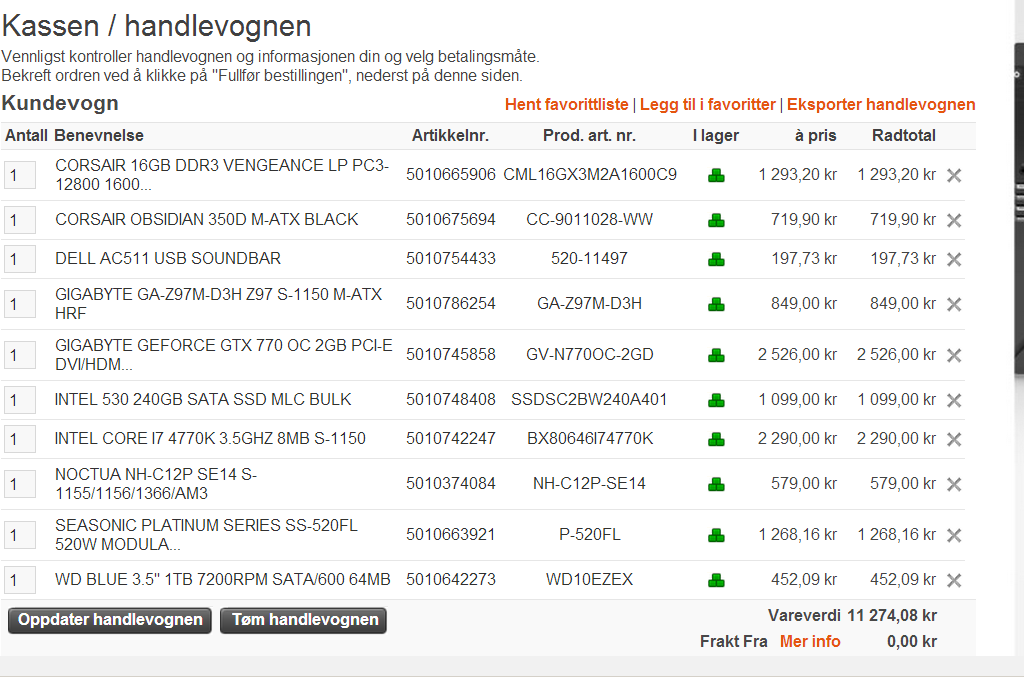 Christian Thork Skrevet 29. mai 2014 Skrevet 29. mai 2014 Da jeg har ettromsleilighet er det et poeng at den er dødens stille. Siden jeg heller ikke skal bruke SLI noengang så er det helt OK med M-ATX og PSU med liten effekt. Det jeg lurer mest på er om oppsettet er riktig (ie. alt passer sammen) og om det finnes andre gode alternativer. Jeg bytter fra I7 til I5 og fra 770GTX til 780GTX. Hva med et lydisolert kabinett og en billigere PSU? Var temmelig dyr den. Ellers ville jeg sett på 280x som yter like bra, bare billigere. Er ikke 350D ganske isolert? Tror jeg bytter til I5 og tar 780GTX ja. Hva med Z97 og 1866MHz tho? Finner ingen ATX-kort som støtter 1866 heller.. Du må sette de i XMP i Bios (xtreme memory profile) Hm? Betyr det at kortet ovenfor (http://www.dustinhome.no/product/5010786254/gigabyte-ga-z97m-d3h-z97-s-1150-m-atx-hrf/) støtter 1866MHz og jeg kan kjøpe det? Ja Nice!