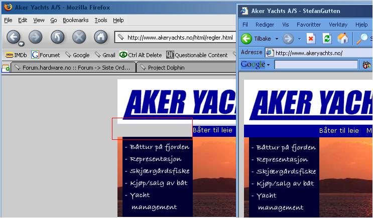 Kenneth Dammyr Skrevet 5. april 2005 Skrevet 5. april 2005 (endret) Hey! Check it out folks : http://www.akeryachts.no Selvlagd er vellagd. meny, vinliste og sjøveisregler sidene hopper litt til venstre når jeg klikker innpå de.. altså de ligger litt mer til venstre en de andre sidene. savner en rollover effekt på linkene, også bruker du feil font på forsiden under bildet iforhold til de andre sidene. men ellers ser det veldig bra ut. edit: ja også burde kontaktinfo heves litt bedre ut, dette er jo tross alt nesten det viktigste på hele siden. Hvilken nettleser bruker du? Har fått tilbakemeldinger på at FF har noe som må fikses ihvertfall. Er ikke slik i IE. Rollover blir for space for dette synes jeg. Glemte formatere teksten på forsida. Hadde nettopp senka kontaktinfo. Den var for tydlig på liten oppløsning(1024x768). Men jeg ser at hos meg (1600x1200) er den liten. Kanskje jeg finner en mellomting. Så skal det sies at den ikke er ferdig da. Skal komme mange flere båter osv. Og integreres med noe finn.no-greier. Takk for respons God natt. Endret 5. april 2005 av kennethdammyr