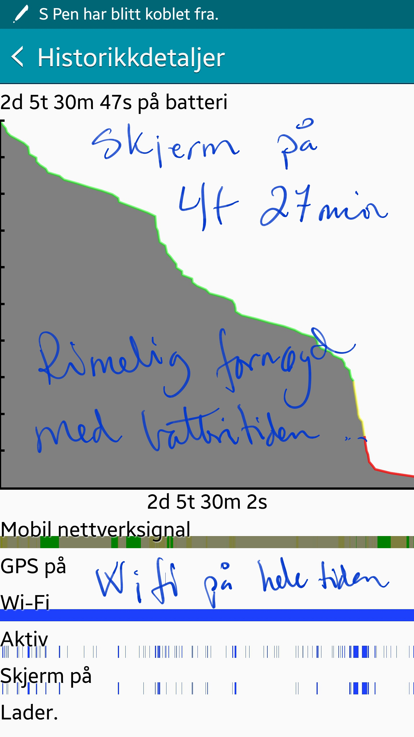 avtrekkeren Skrevet 25. oktober 2014 Skrevet 25. oktober 2014 (endret) Dette er etter andre lading (første fulle lading fra 0% - 100%) - må si meg storfornøyd egentlig, med 4.5 timer skjerm og over 2 døgn siden forrige lading. Wi-fi alltid på. 90 av disse minuttene var Liverpool vs Hull via TV2 Sumo-appen Endret 25. oktober 2014 av KriFos