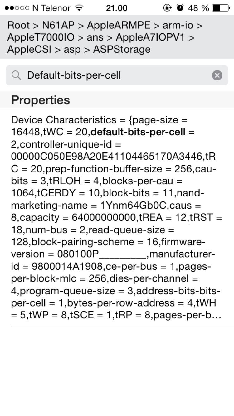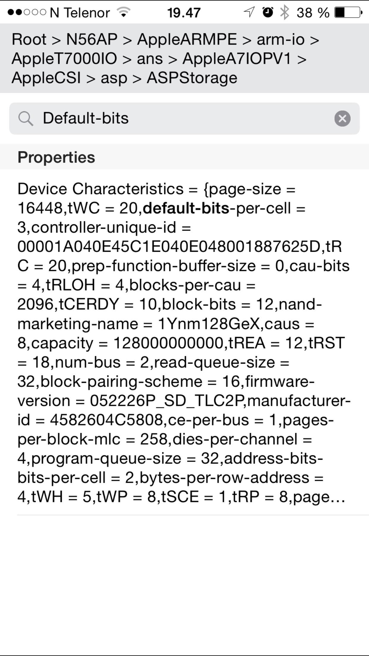 Jeg la inn denne sjekken på min iPhone 6 plus 64GB og fant at jeg har default-bits-per-cell = 3, altså TLC.