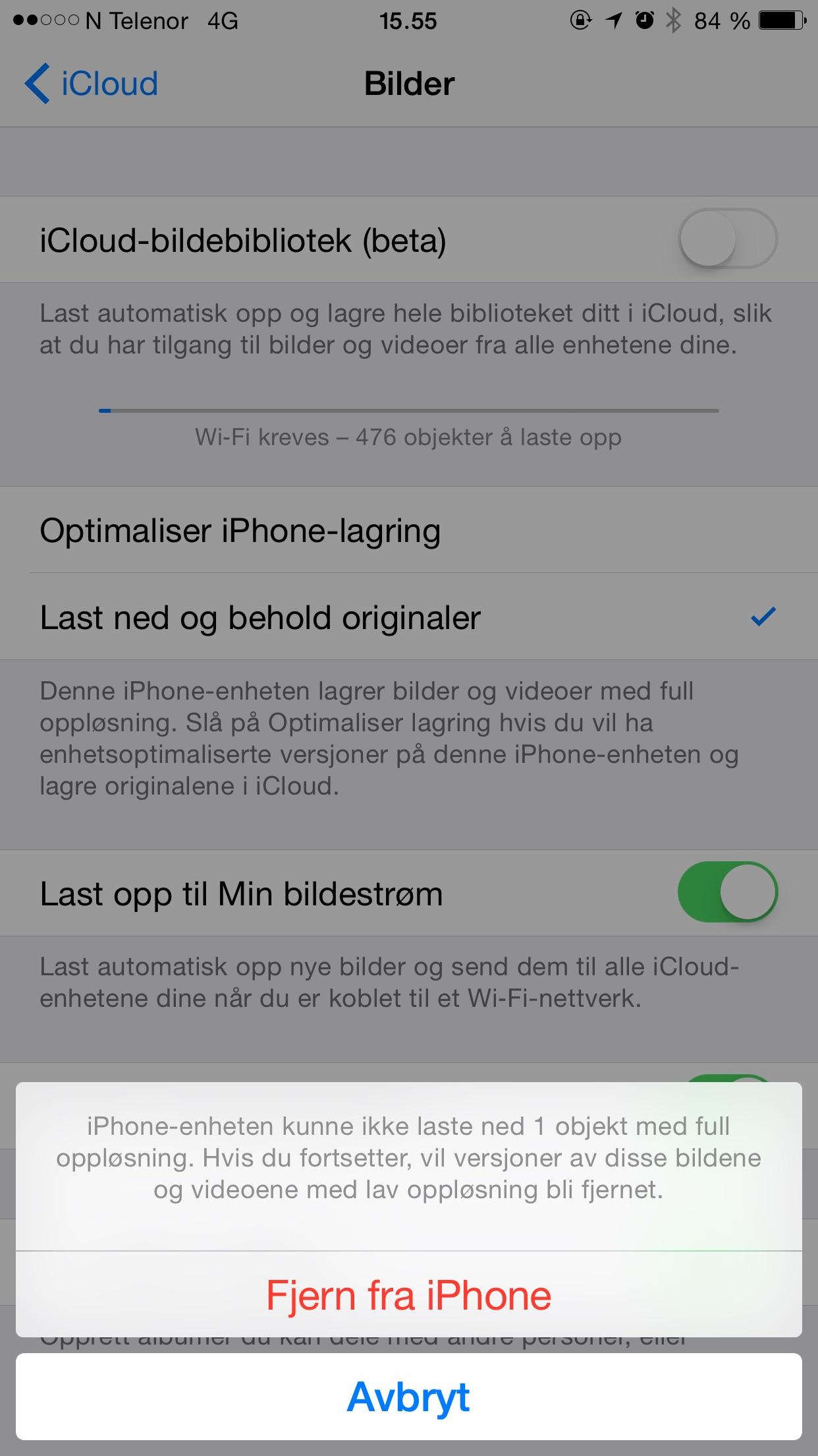 AllFather: Prøvde å skru av iCloud-bildebiblioteket, men da kom det opp en melding om at alle lavoppløste bilder (kopier?) blir slettet, så tenkte jeg skulle spørre her før jeg gjorde det.
