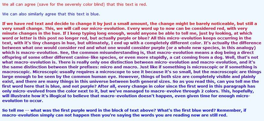 covah Skrevet 2. april 2018 Skrevet 2. april 2018 Jeg tror ikke du helt skjønner hva evolusjon er. Det er ikke sånn at feks. en hund plutselig føder noe helt annet. Evolusjon er at det skjer små endringer over LANG tid, gjerne tusenvis av år. Se på bildet under. Hvor slutter teksten å være rød og gå over til blått? Vanskelig å sette et nøyaktig skille? Det er akkurat slik evolusjon foregår. 4