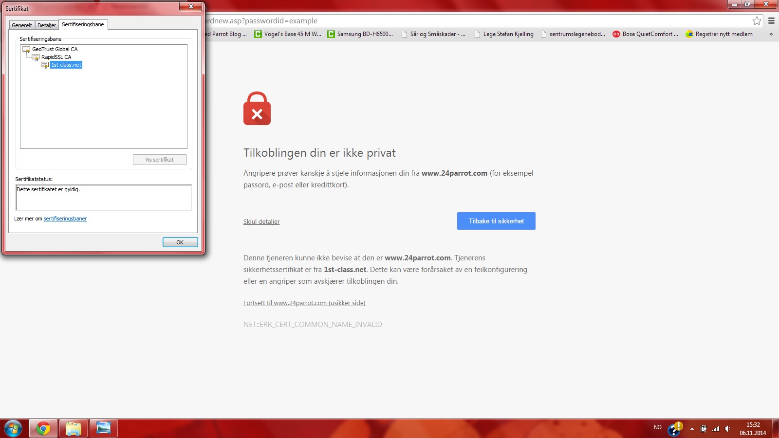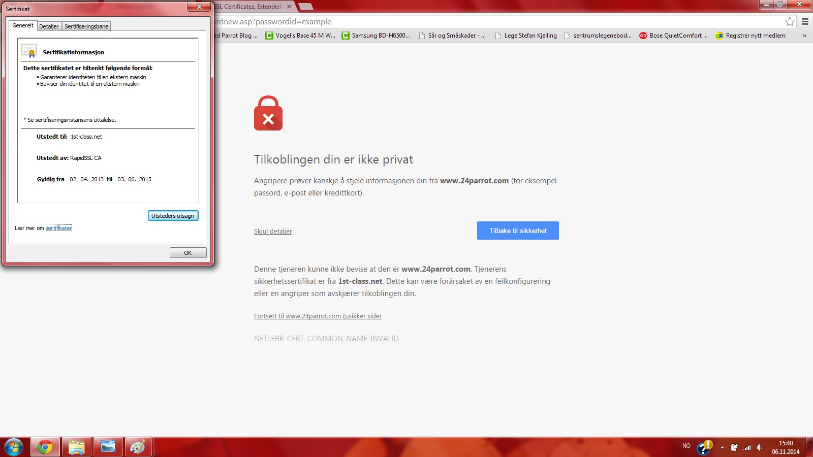 tHz Skrevet 6. november 2014 Skrevet 6. november 2014 (endret) Vet ikke om dette holder. Bildet til høyre var da jeg trykte på utsteders utsagn. Det er ikke et egensignert sertifikat. Så det er håp Dette ser mer ut til å være en feilkonfigurasjon på serversiden. Sertifikatet er for domene 1st-class.net som ligger på samme server. Det er ikke noe galt hos deg, for jeg får samme melding her (burde seff forsøkt det med en gang.. beklager det). Man bør være forsiktig med steder som ikke har sertifikat i orden, så ikke legg igjen noe informasjon der. Men så lenge det ikke er et egensignert sertifikat ville jeg satse på at det går greit å besøke siden. Endret 6. november 2014 av tHz