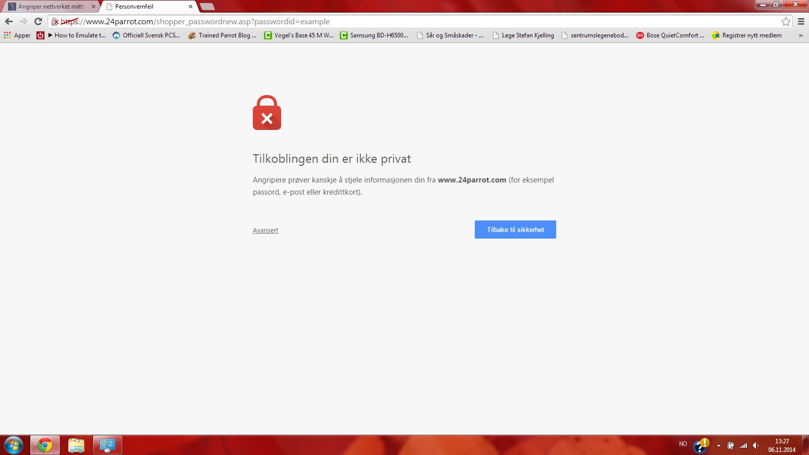 medlem-128219 Skrevet 6. november 2014 Forfatter Skrevet 6. november 2014 Nå er vi inne på noe jeg ikke har vært borti før, og er litt bekymra. Når jeg skal logge inn på forskjellige nettsteder, kommer det ofte opp en advarsel om at noen prøver å lure meg over på feil side for å hente sensitiv informasjon/angriper nettverket mitt. Hva i all verden gjør jeg med dette? Er neppe trykt nå å betale regninger feks? Hva kan jeg gjøre for å bli kvitt dette problemet og gjøre nettverket mitt sikkert? Er passordbeskytta hjemmenettverk. På en side som heter northernparrots.com, der jeg skulle få tilsendt nytt passord, fikk jeg beskjed om at tilkoblingen ikke var privat, og at det var angripere som kanskje var ute etter kredittkortopploysninger etc.