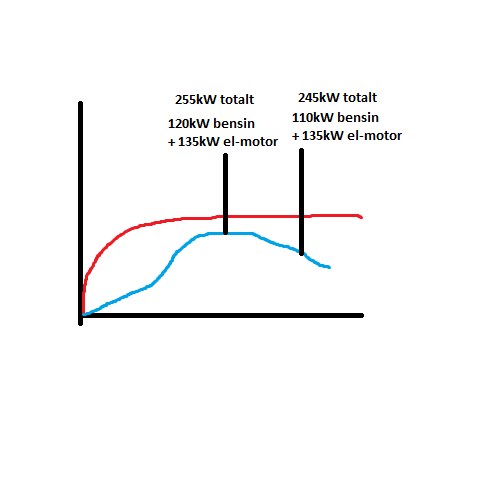 Gavekort Skrevet 19. november 2014 Skrevet 19. november 2014 Dreiemoment og effekt trenger ikke å ligge i samme område, men det bør ligge i samme område på begge motorene, noe som kunne blitt fikset med giring, men det skal ikke være et problem på el-motorer siden de har en ganske flat kurve. Så lenge begge motorene fungerer optimalt om hverandre så kan du stable effekten og dreiemomentet, om de ikke gjør det så vil aldri begge motorene være i en optimal omdreining. Jeg laget en liten tegning for å illustrere hva jeg mener. Jeg bruker to eksempelkurver, der en er en bensin-motor, siden disse har en litt mer varierende kurve som gjør det lettere å vise hva jeg mener. Disse to kan under alle omstendigheter plusses sammen til en total effekt, på lik linje med to ulike personer som trekker i et tau.