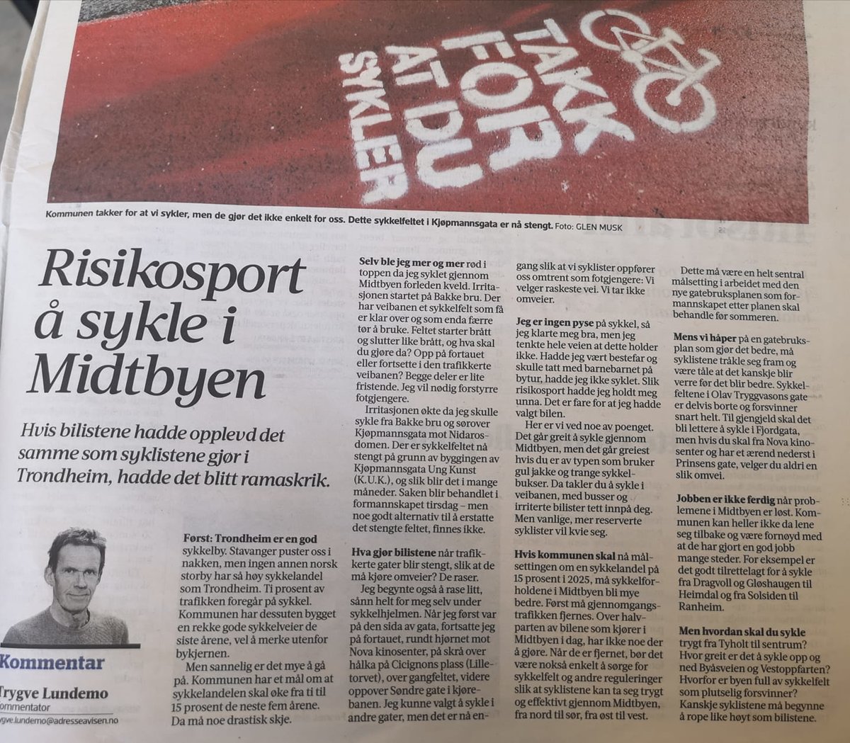 SeaLion Skrevet 3. mars 2020 Forfatter Skrevet 3. mars 2020 En innsender i Adresseavisen oppfatter sykling i sentrum som en uoversiktlig risikosport. Dette er i Trondheim, men det er nok gyldig også andre steder i Norge. 1