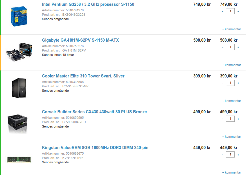 tmg Skrevet 29. oktober 2015 Forfatter Skrevet 29. oktober 2015 Hva med denne lista? Vil dette fungere, da ender prisen på 2700, noe over de 2000 jeg skulle ønske jeg slapp unna med, men det er fortsatt et relativt lavt tall.
