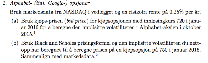 TheNarsissist Skrevet 6. november 2015 Skrevet 6. november 2015 (endret) Hei, proffersorern min har lagd en opsjonsoppgave jeg virkelig ikke får til, og det irriterer meg. Han viser til at en måte å løse den på er å bruke formelen: Aksjeprisen er 721.11 og Bid for innløsningskursen 720 15 Januar 2016 er 25.20. Siden innløsningskursen IKKE er lik aksjeprisen har jeg funnet ut at det er bedre å bruke Corrado og Millers: Det jeg ikke forstår er tidsperspektivet. Informasjonen jeg har oppgitt er for januar 2016, og jeg skal finne vollaiteten for oktober 2015. Ville ikke det omvendte vært mer logisk? Hadde det vært omvendt skulle jeg vel satt 275/365 for tid, men forstår virkelig ikke dette. Endret 6. november 2015 av TheNarsissist