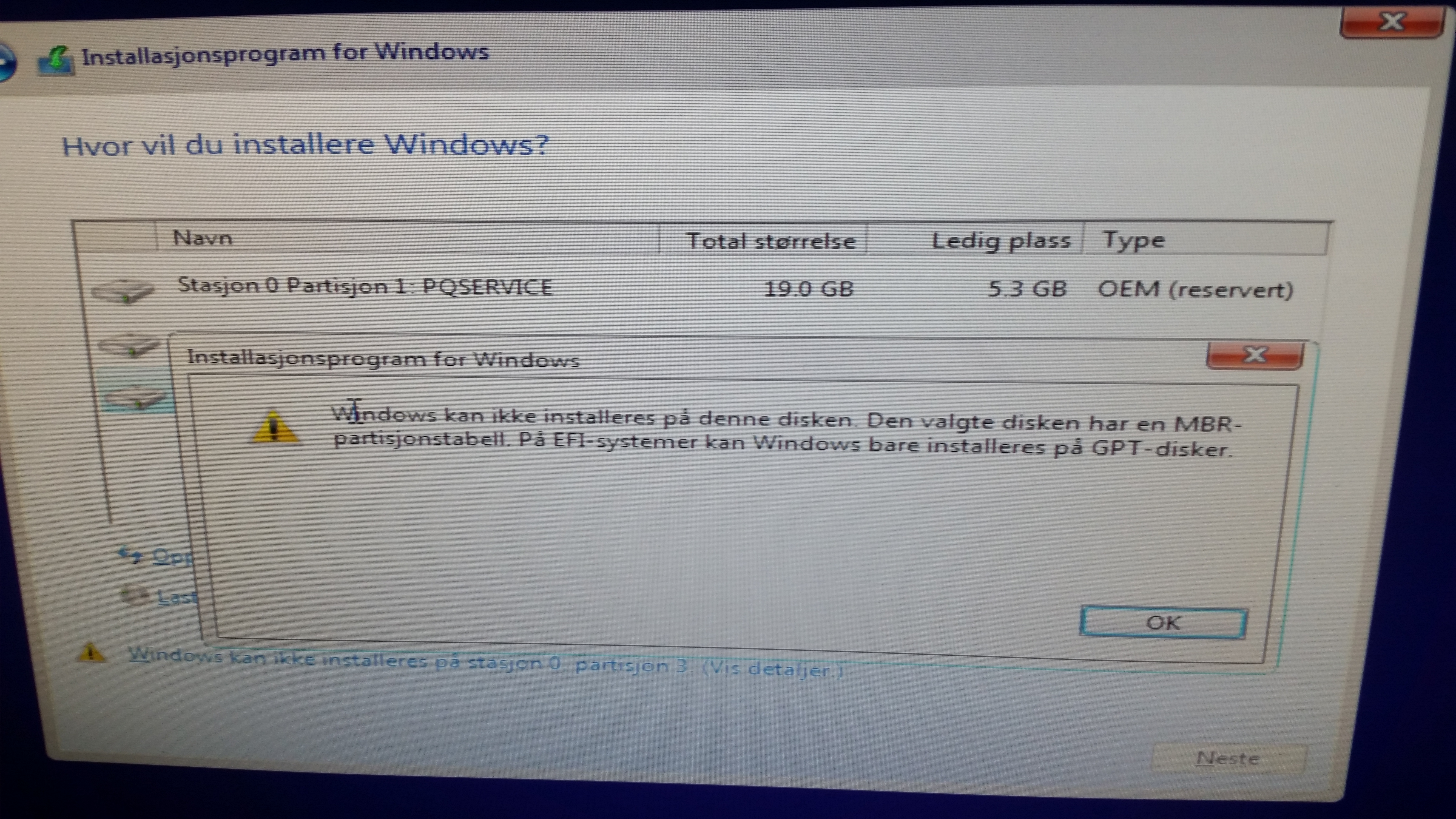 oleespen Skrevet 18. februar 2016 Skrevet 18. februar 2016 Hei PCen slo seg brått av og på igjen av seg selv, fikk da opp beskjed om "discreader feil, press controll alt delete for restart", denne kom bare på nytt uten at jeg kom videre, hadde akkuratt (et par dager siden) hatt et annet problem så windows var akkuratt reinstallert - så tenkte å bare installere på nytt igjen fra USB. Kommer nå til stedet hvor du velger partisjon. Får da følgende feilmelding: "Windows kan ikke installeres på denne discen. Den valgte discen har en MBR partisjonstabell, på EFI systemer kan windows bare installeres på GPT-discer." Har testet å formatere og annet jeg kan gjøre fra den menyen. Hva kommer dette av? Noen som kan hjelpe med dette? Lagt ved bilde