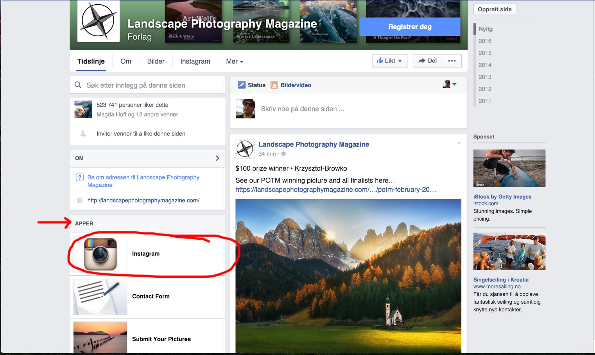 Kenneth Solfjeld Skrevet 8. mars 2016 Skrevet 8. mars 2016 Jeg har en fotoside på Facebook og ønsker å legge til Instagram under fanen apper. Jeg ser at mange har det på sine sider, men jeg finner ikke ut hvordan jeg skal gå frem for å få det til. I innstillinger under "apper" finner jeg at "notater" er lagt til som app, men der er ingen andre valgmuligheter. Veldig kronglete av Facebook dette. Legger ved et eksempel på hva jeg mener. Har tatt en skjermdump av Landscape Photography Magazine sin Facebook side: