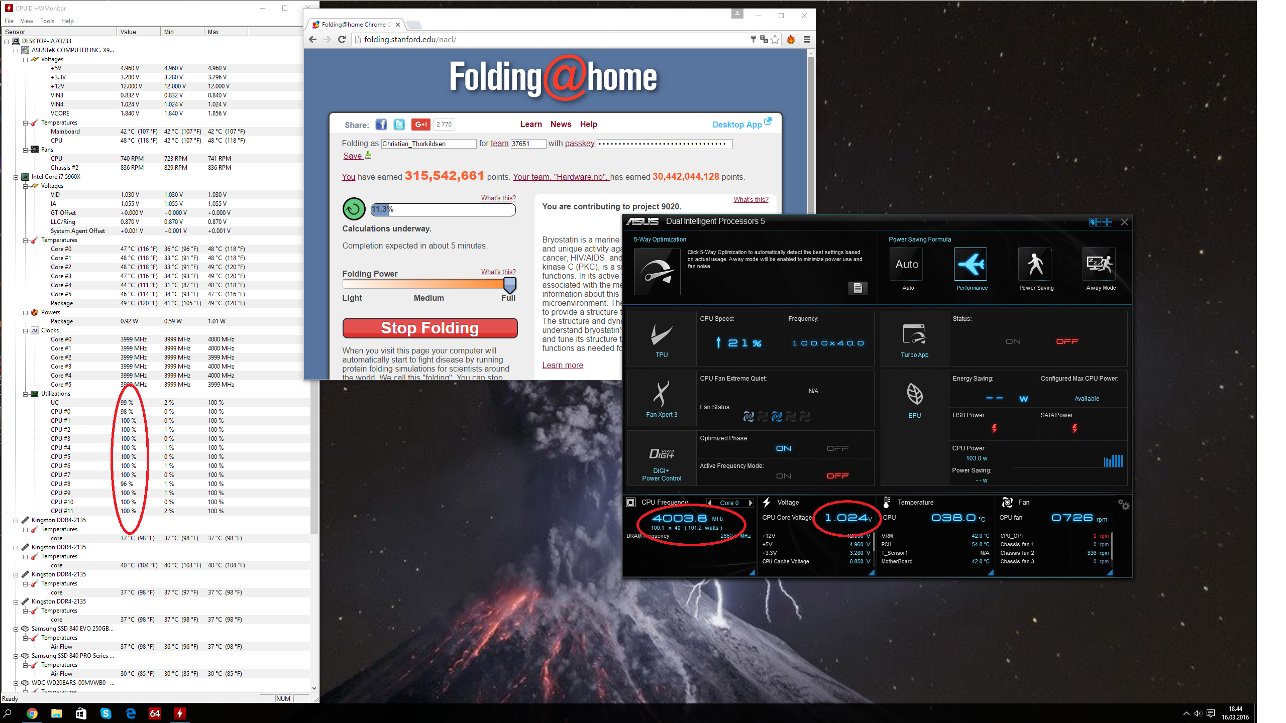 Christian Thork Skrevet 16. mars 2016 Skrevet 16. mars 2016 (endret) Brb, skal disable 2 kjerner, teste 4000mhz og sjekke forbruk. Aisuite, og utifra temp så stemmer det nok. Stock 5960x blir endel varmere, så høyere strømtrekk tipper æ. 4000x100. 6 aktiver kjerner, 12 aktiver tråder. Her er forbruk på 5960X 3700/3700 og 980Ti på 1500. Kortet trekker ca 300 ellerno + alt annet i systemet, HDD, ssder, 9 vifter og pumpe osv. aner ikke strømbruket på det. Under 100% load. Endret 16. mars 2016 av Snusmumr1kk1