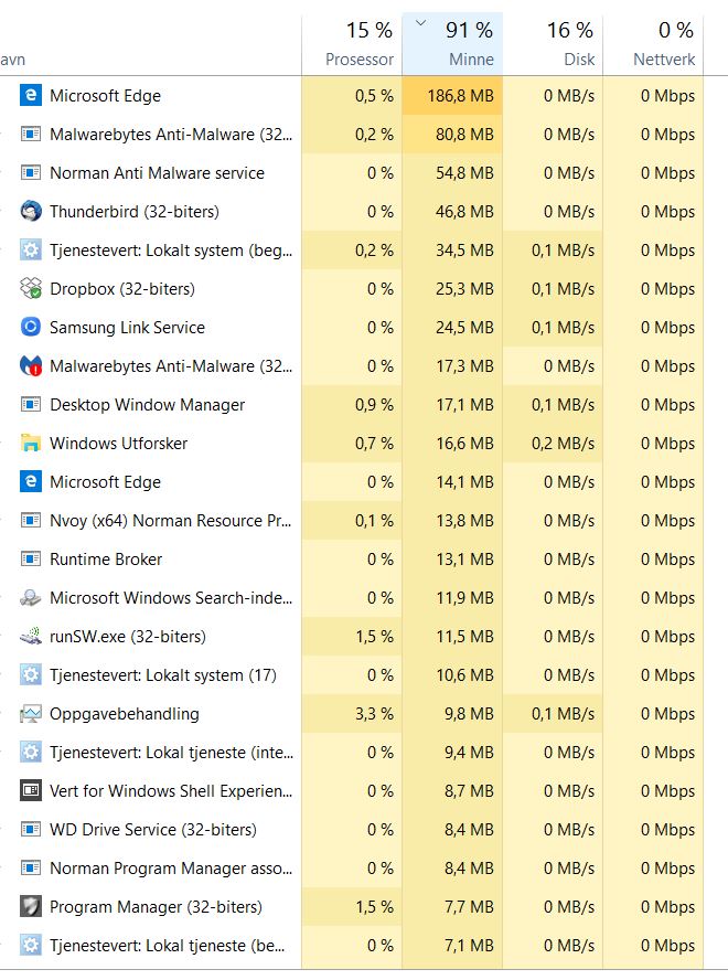 PhilATList Skrevet 5. juli 2016 Skrevet 5. juli 2016 Jeg trenger hjelp, og jeg er ikke særlig datakyndig (lenger). Maskinen min vil nesten ikke gjøre jobber for meg for tiden. Programmer svarer ikke, lang responstid, av og til blå skjerm uten feilmelding. Jeg ser at minnebruken stadig ligger over 90 %, dette til tross for at jeg ikke kjører andre programmer, kun nettleser. De oppgitte tallene for minnebruk tilsier kanskje et minnebruk på rundt 1 GB, men jeg har 4 GB installert. Hva er det som legger beslag på minne, og hvordan løser jeg opp i dette? Stasjonær maskin et par år gammel, Packard Bell. Kjører Windows 10 Prosessor oppgitt til AMD Athlon II X3 445 3,10 GHz 64-biters operativsystem og altså 4 GB RAM