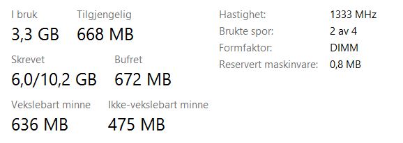 PhilATList Skrevet 6. juli 2016 Forfatter Skrevet 6. juli 2016 Mange takk for innspill! Årene går fort, så du har sikkert rett i at maskinen min er noen år eldre enn jeg antydet. Jeg har kjørt memtest nå, og det ble ikke funnet noen feil. Så jeg sliter fortsatt med en meget uvillig PC. Jeg legger ved to bilder fra oppgavebehandling. Jeg forstår ikke tallene, kan jeg ha nytte av å lese av vekslebart og ikke-vekslebart minne for eksempel? Hva betyr tallene? Og opplistingen av minnebruk : summen av tallene er kanskje ikke mer enn 1 GB, likevel sier maskinen at jeg bruker rundt 3,5 GB. Kan jeg ha rett i en mistanke om at det er noe styggedom på maskinen min som usynlig spiser av minnet?