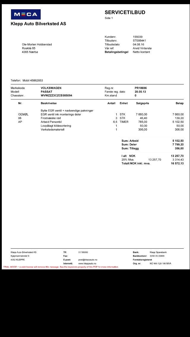 Verkstaden ringte meg opp igjen og sa at EGR ventilen var defekt, dette kostet 16.500.