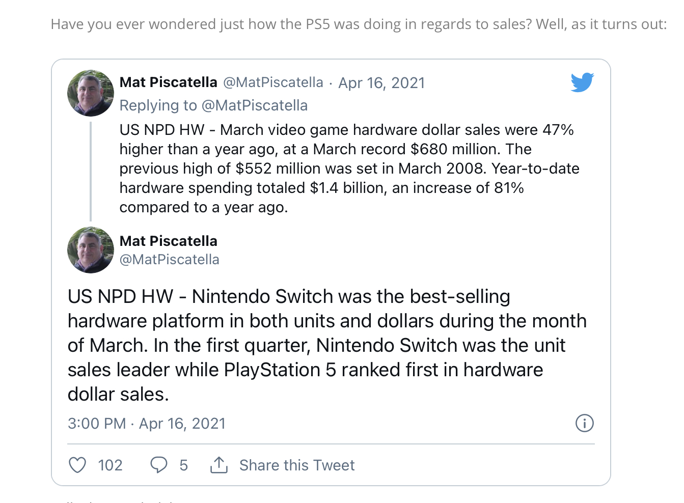 PÃ¥inter Skrevet 16. april 2021 Skrevet 16. april 2021 PS5 NOW FASTEST-SELLING CONSOLE IN US HISTORY, STILL LOSES TO ANOTHER CONSOLE https://thathashtagshow.com/2021/04/16/ps5-now-fastest-selling-console-in-us-history-still-loses-to-another-console/ 1