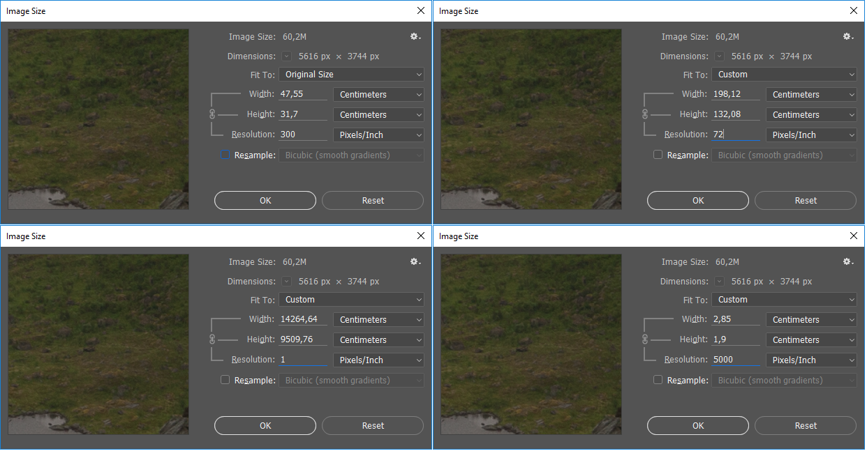 Trondster Skrevet 13. oktober 2016 Skrevet 13. oktober 2016 (endret) Ingen fare - dette er ikke et problem. Et bilde på 3456 x 5184 er på 3456 x 5184 piksler uansett hva dpi (eller rettere sagt PPI, som det egentlig heter) er. Hva dpi er satt til betyr INGEN TING for bildekvaliteten til et digitalt bilde - det ENESTE det betyr er hvor stort bildet skal printes hvis du ikke endrer det i det du skal skrive det ut. Du kan sette dpi til 72, 300, 1 eller 500000 - og det er fremdeles det eksakt samme bildet på 17,9 megapiksler. Det eneste det at bildet er satt til 72 PPI betyr, er at bildet på 3456 x 5184 pr. default (altså hvis du ikke endrer noe i valg på printeren) blir skrevet ut på en størrelse på 72 piksler per tomme, dvs 3456/72 = 42 tommer = 121,92 cm x 5184/72 = 72 tommer = 182,88 cm. Du kan trivielt endre dpi i bildet til akkurat den verdien du vil i ethvert bilderedigeringsprogram, men det betyr som sagt ingen ting for bildekvaliteten. Endring av ppi har bare noe å si for bildekvaliteten hvis du samtidig reskalerer bildet til en annen størrelse i cm (eller tommer) og dermed også en annen størrelse i piksler - men så kommer endringen av at du dermed endrer antall piksler, og ikke dpi-endringen i seg selv. Hvis noen klager på at bildet ditt "ikke har nok dpi", så vet de rett og slett ikke hva de prater om. Sett dpi til 5000, send bildet inn igjen og spør om det er nok. *sukk* For å endre ppi(dpi) i Photoshop: Velg Image -> Image Size, men ikke huk av for "Resample": Her kan du endre ppi fra 1 til 5000. Legg merke til at størrelsen i piksler ikke endrer seg - og heller ikke bildekvaliteten - det eneste som endrer seg er default utskriftstørrelse - en ppi på 1 gir "litt" større fysisk utskrift enn ppi på 5000. Men igjen - dette er kun defaultinnstillinger, og dette overstyrer du uansett når du skal skrive ut. Endret 13. oktober 2016 av Trondster 4
