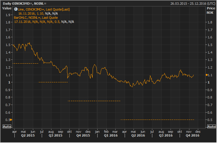 Papegøye Skrevet 17. november 2016 Skrevet 17. november 2016 Og det oppdaterte bildet; For øyeblikket er pengemarkedsrenten ca 15bps høyere enn den var på det laveste, etter at Norges bank kuttet renten i fjor. Helt fair at bankene setter opp rentene med like mye da imo