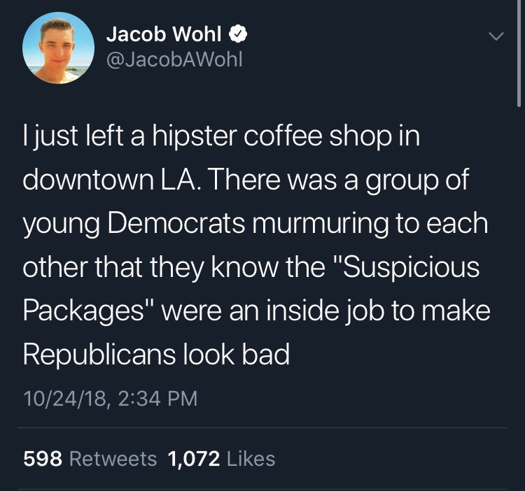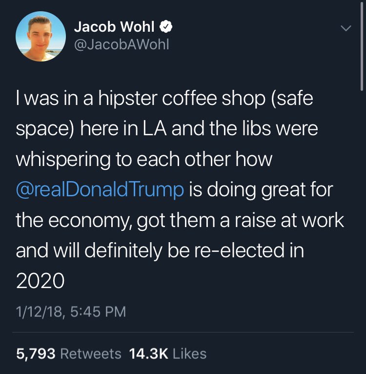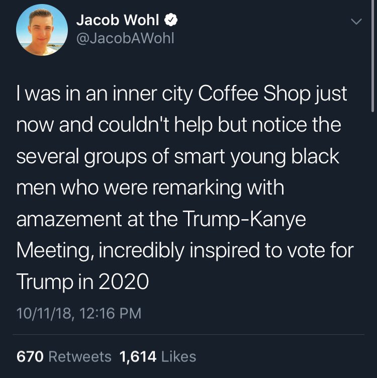 Mchansern Skrevet 30. oktober 2018 Skrevet 30. oktober 2018 Grunnen til at jeg mener at Jacob Wohl, mannen som trolig står bak svertekampanjen til Robert Mueller er den morsomste kontoen på twitter er dette her forresten. Mannen er vanvittig glad å drikke kaffe og hver gang han drikker kaffe på hipsterkafeer rundt om så hører han mye rart. 4