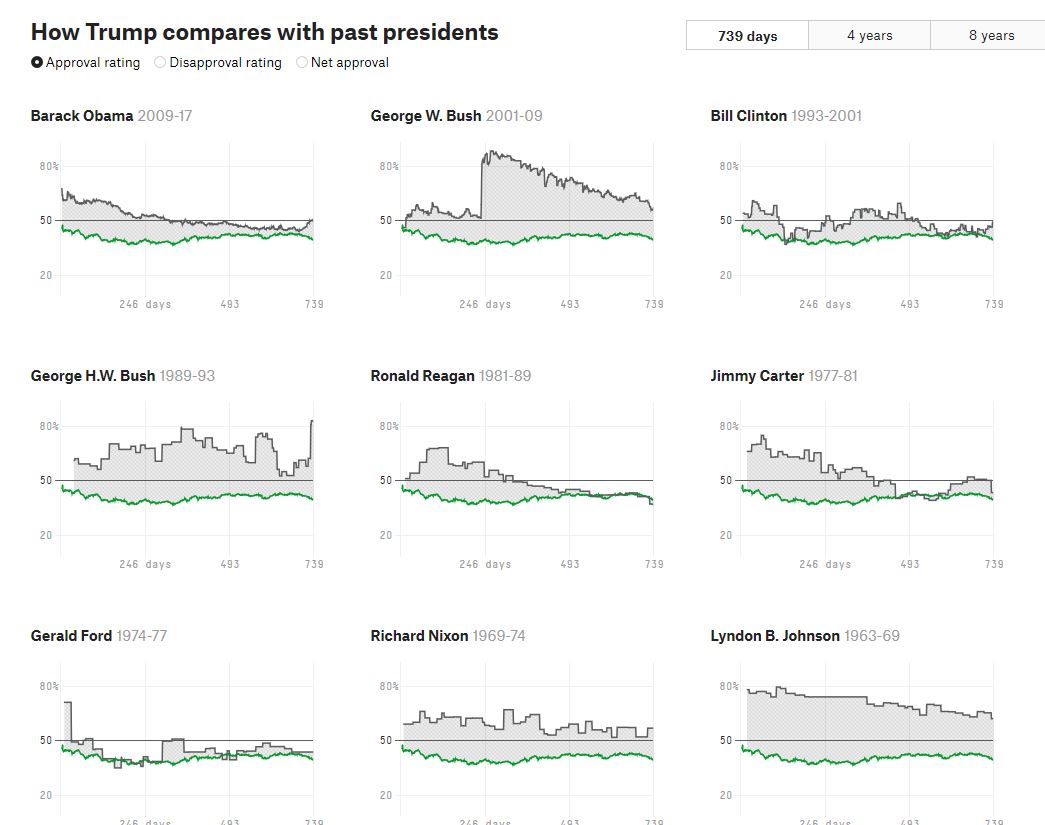 Anbefaler deg igjen å ta en titt på siden. Ser du den grønne grafen nederst på alle skalaene? Hint: Det er Donald sine målinger, altså hans gjennomsnittsmålinger. Ser du den svarte grafen som ligger over den grønne grafen? Hint: Det er andre presidenters gjennomsnittsmålinger. Skjønner du mer nå? Til slutt en virkelig nøtt: Hvem viser konsekvent dårlige målinger på de grafene? Si fra om du trenger fler hint.