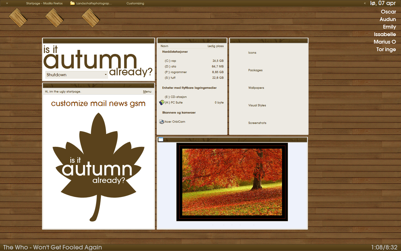 Tordenflesk Skrevet 8. april 2007 Skrevet 8. april 2007 Hvordan får jeg til skriften i windows? Hvor skal jeg legge filene ?Windows\Fonts Og hvordan bytter jeg ut iconene med de som følger med?Iconpackager Fikk heller ikke til firefox filene.Google Userchrome.css så vet du hvor den skal puttes. Skins drar du bare inn i Skins-vinduet i firefox BBleanColorpad iShut Litestep Styler Toolbar True Launch Bar Mdia Control ...vet jeg ikke hva er engang. BBLean: Alternatvit Shell iShut: skin-bar "Skru av/reboot/logg av"-dings Litestep: Alternativt Shell Styler Toolbar: skin-bar toolbar som erstatter Explorer og Internet Explorer sine standard toolbars.