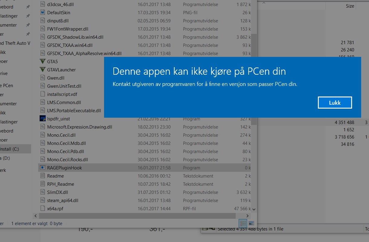 landaask Skrevet 16. januar 2017 Skrevet 16. januar 2017 (endret) Hei! prøver å laste ned lspd mod til gta5. følger denne videoen: Det stopper HELT opp, 14 minutter 38 sek inn i videoen, for filen RAGEPluginHook bare forsvinner når den flyttes fra winzip og inn i mappen. Ligger i mappen i 2 sek, også bare poof, vekke. samme hvis jeg flytter den ut på skrivebordet.. Og når jeg endelig fikk den til å bli, får jeg beskjed om at appen kan ikke kjøres på denne pcen.. Har windows 10, 64 bit så hva nå? Håper noen vet! har prøvd å google, men finner ikke noe svar Endret 16. januar 2017 av landaask