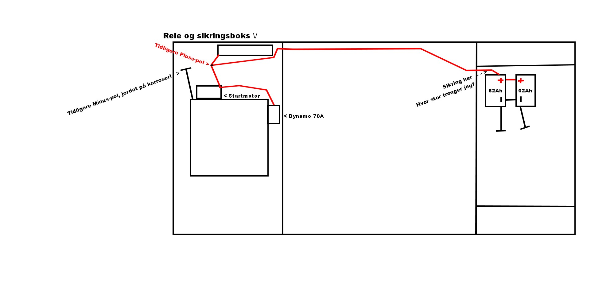 Kontorpult (Øystein) Skrevet 21. februar 2017 Skrevet 21. februar 2017 Heisann, skal flytte batteriet bak og koble opp to like der, da det ikke blir plass til batteri i motorrommet når jeg skal bytte til en annen motor. Samt at det gjør det lettere å koble bilstereo Har prøvd å tegne det slik jeg tenker å koble det, men ikke sikker på om dette blir helt riktig. Går for 50mm2 kabel på både pluss og minus. Trenger jeg en minus-kabel fra batteri bak til jording til motorblokk? Eller vil det gå uten? Planen er uansett å ordne en slik ledning etterhvert, men koster jo sitt de ledningene. Bilstereo går det nok en stund før jeg begynner å bygge i bilen, motor er hovedprioritet Tenker bare å koble meg rett på den eksisterende pluss-polen i motorrommet, funker det, eller vil det være bedre å koble direkte på starter og så trekke en derfra til forbruk? Kan det lønne seg å trekke en pluss ledning fra dynamo til batteri i senere tid? Jeg må vel ha sikring ved batteriet? Hvor stor må jeg ha der? Batteriene er 2x 62Ah for å kunne bruke det så godt som nye 62Ah batteriet jeg allerede har, dynamo lader 70A, originalt satt det en 55A der. Vil 70A klare å lade opp alt på en tur på 2-3mil? Bygger en egen boks til batteriene baki og skrur det godt fast, samt lager et oversiktlig sikringssystem for ekstra strømforbrukere Ellers noen tips på veien? Trekker den inn i bilen, og på motsatt side i bilen går det bensinrør og bremserør, derfor er det trukket på den siden av bilen.