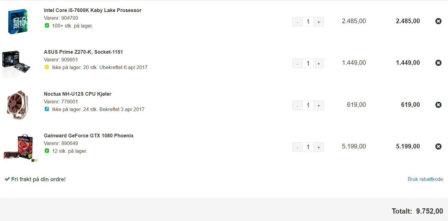 Betroz Skrevet 29. mars 2017 Skrevet 29. mars 2017 Dette blir like under 10 000 kr med det tilbudet på skjermkortet :