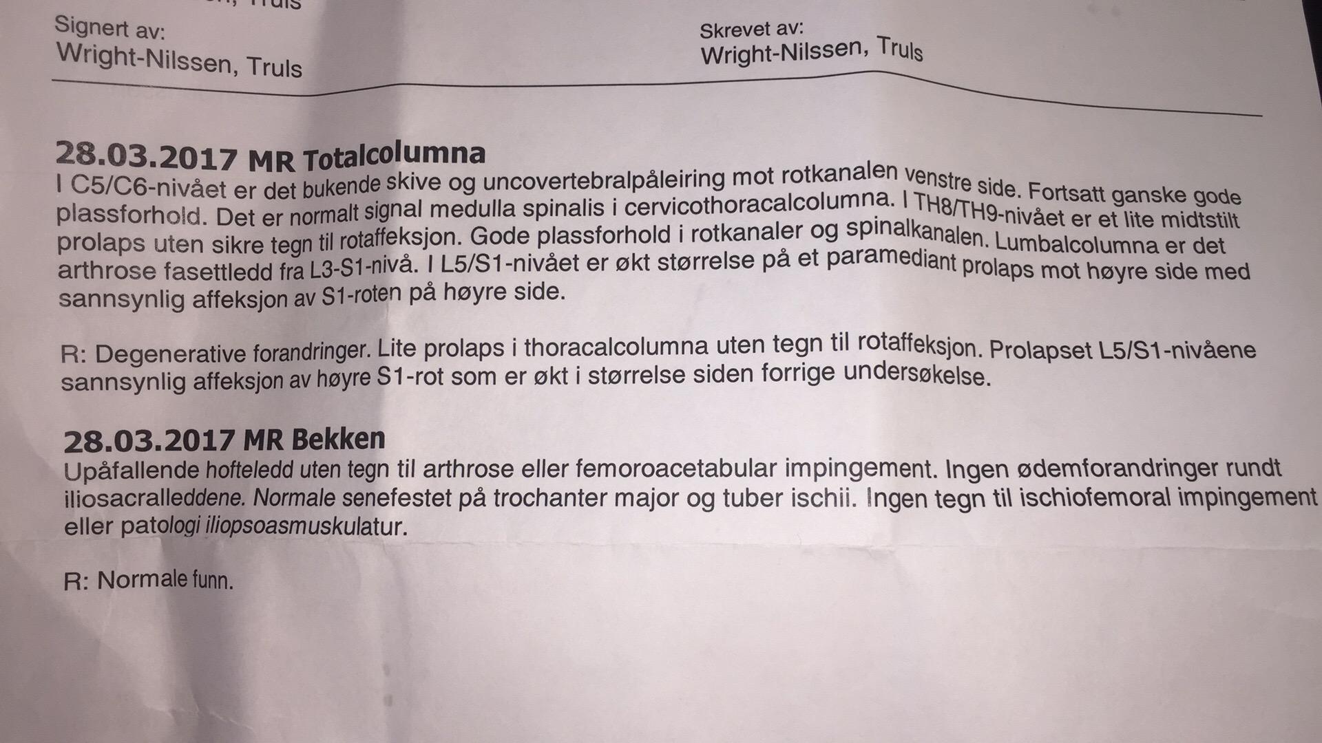 AnnonymG Skrevet 30. mars 2017 Skrevet 30. mars 2017 Hva er plagene dine?For å forklare brevet ditt med enkle ord: I nakken din, er det i ryggvirvel C5 og C6 (C = cervikal (som betyr nakke), 5 er nummeret til nakkevirvelen) er det en del av skiven som ligger mellom disse to ryggvirvlene som tyter litt ut over sin normale posisjon, men dog så er det god plass og den presser ikke mot noen nerve. Det er ellers ingen andre forandringer i ryggraden i nakke og øvre del av ryggen. I midtre del av ryggen (Th8/Th9 - T = thorax (ribbekasse)) så er det et lite prolaps, uten sikre tegn til at det presser på nerverøttene. Det er god plass i alle de hull hvor nervene kommer ut fra ryggmargen. I korsryggen er det leddslitasje (arthrose) helst nederst i korsryggen. Der er det også et prolaps som trykker på en nerverot - på høyre side. (Dette kan gi symptomer som smerte/ubehag langs baksiden av lår og legg) Bekkenet er helt normalt, hofteledd er normale uten slitasje. Bare for å gi en liten forklaring på fremmdord: Ryggraden består av ca 32-33 ryggvirvler. De øvrest 7 kalles cervikale ryggvirvler, og er nummerert C1 til C7. De neste 12 kalles thorakale ryggvirvler og er nummerert Th1 - Th12. De nederste ryggvirvlene er nummerert L1 -L5, hvor L står for Lumbal ryggvirvlel. C1 C2 C3 C4 C5 C6 C7 Th1 Th2 Th3 Th4 Th5 Th6 Th7 Th8 Th9 Th10 Th11 Th12 L1 L2 L3 L4 L5 Sakrum (det nederste store knokkelen som fester ryggraden og bekkenet) Prolaps: når skiven mellom to ryggvirvler tyter ut. Dette kan medføre at en nerverot (nervens utspring fra ryggmargen) blir klemt sammen, og derfor blokkerer nervesignaler. Bukende skive: skive mellom to ryggvirvler som tyter ut Uncovertebralpåleiring: leddet mellom to cervikale ryggvirvler (i nakken) som begynner å bli slitt Medulla spinalis: ryggmarg Cervikothoracalcolumna: ryggsøylen i nakke og bryst Lumbalcolumna: ryggsøylen i korsryggen Degenerative forandringer: slitasje Når jeg sier at skiven mellom to ryggvirvler "tyter ut", mener jeg at den stikker litt ut.... Her ser du hvordan en prolaps (skiven mellom to ryggvirvler) "tyter ut" og klemmer på en nerverothttps://www.onlinelege.no/media/56/prolaps-fotolia-copy_300x300.jpgHer har du ryggraden. Vertebra = ryggvirvel. http://d3w5369ycki0q.cloudfront.net/wp-content/uploads/2013/02/dada2.jpg 2