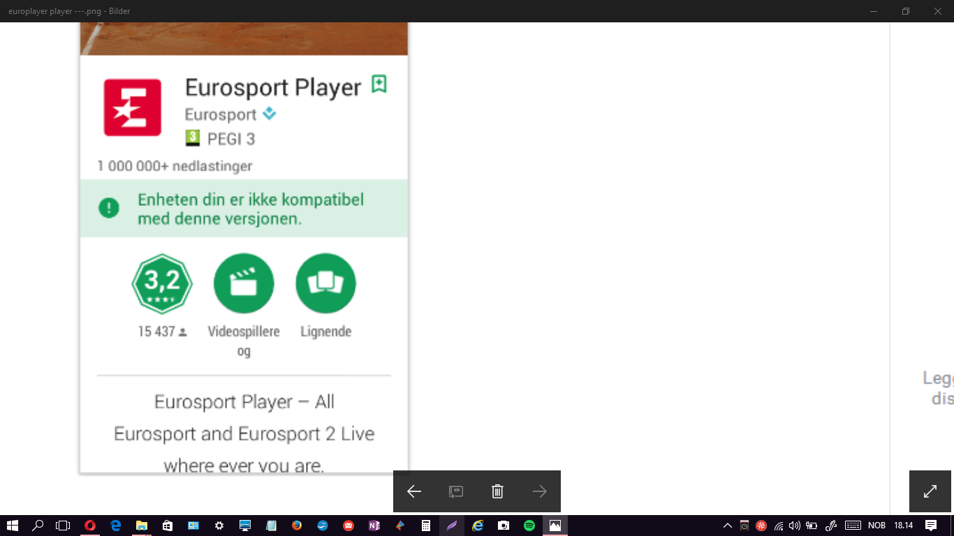 merterje Skrevet 5. april 2017 Skrevet 5. april 2017 (endret) Jeg skulle laste ned Eurosport Player og fant den på PCen. Jeg lastet den ned og det sto at den er installert. Men jeg finner den ikke på PCen, og heller ikke på mobiltelefonen. Hvor er den da installert ? Eneste jeg lurer på er at jeg har en tvillingtelefon som jeg ikke har her, kanskje den er installert der ? Jeg forsøkte å installere det på den telefonen jeg har, men det gikk ikke. Se vedlegg. Endret 5. april 2017 av merterje