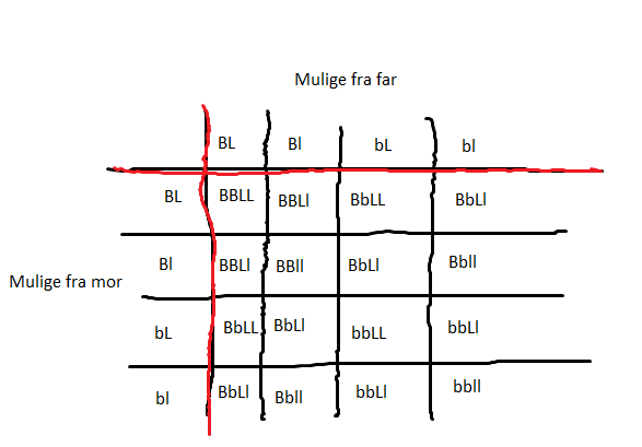 JenJon Skrevet 29. april 2017 Forfatter Skrevet 29. april 2017 a: F1 gen har alle genotyp Bb Ll F2 gen: gener.png PS: hvis to gener sitter på samme kromosom arves de alltid sammen, hvis de er på forskjellige kromosom arves de uavhengig av hverandre, så de kan arves sammen, eller ikke (50/50) Takk!